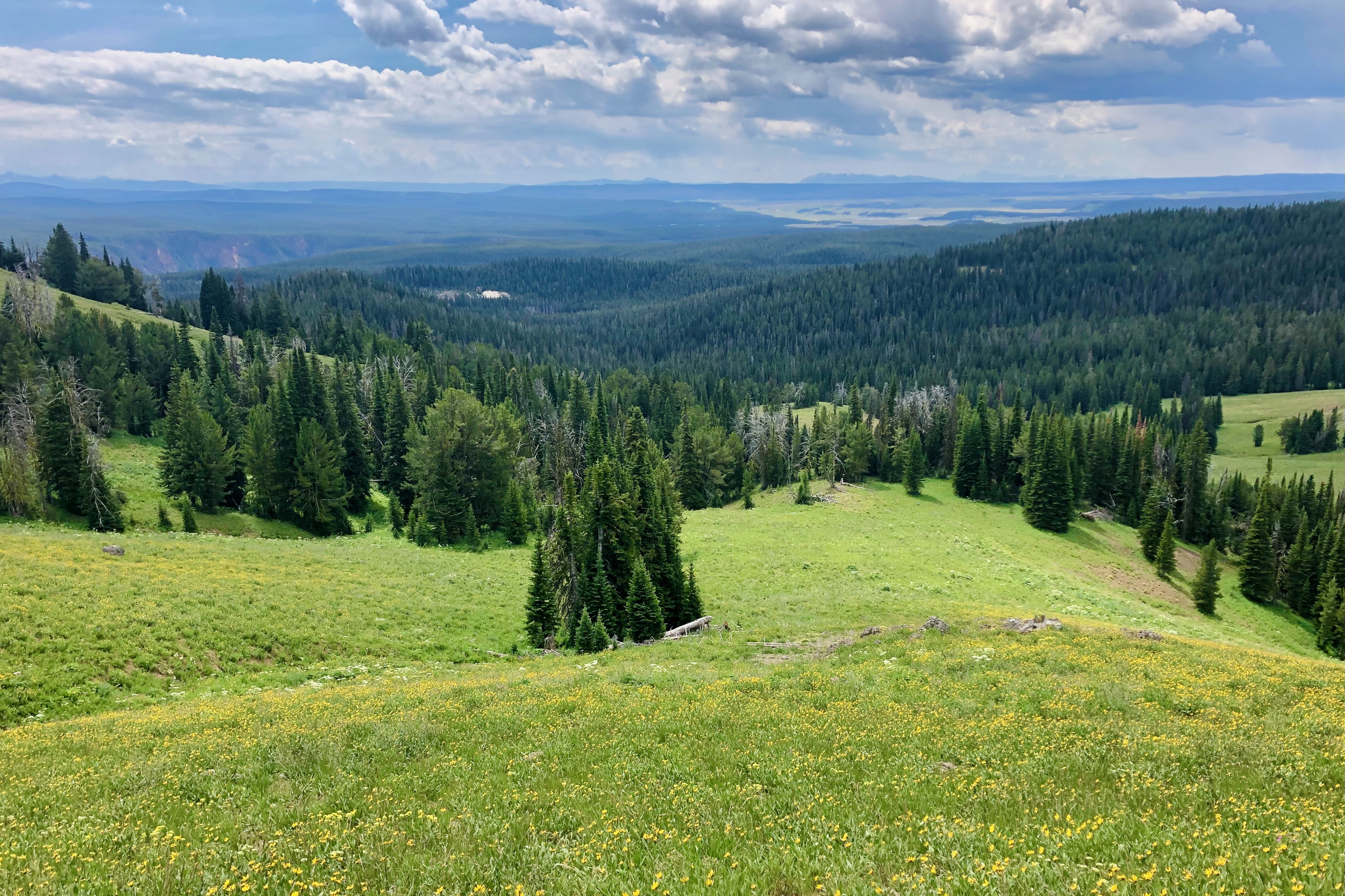 The small parking lot at Dunraven Pass is the trailhead for one of two different hikes to the summit of Mount Washburn. The Dunraven Pass to Mount Washburn is a 7-mile out-and-back trail with 1,400 feet of elevation gain. The trail steadily climbs to the summit, flanked by fields of wildflowers and non-stop panoramic views.