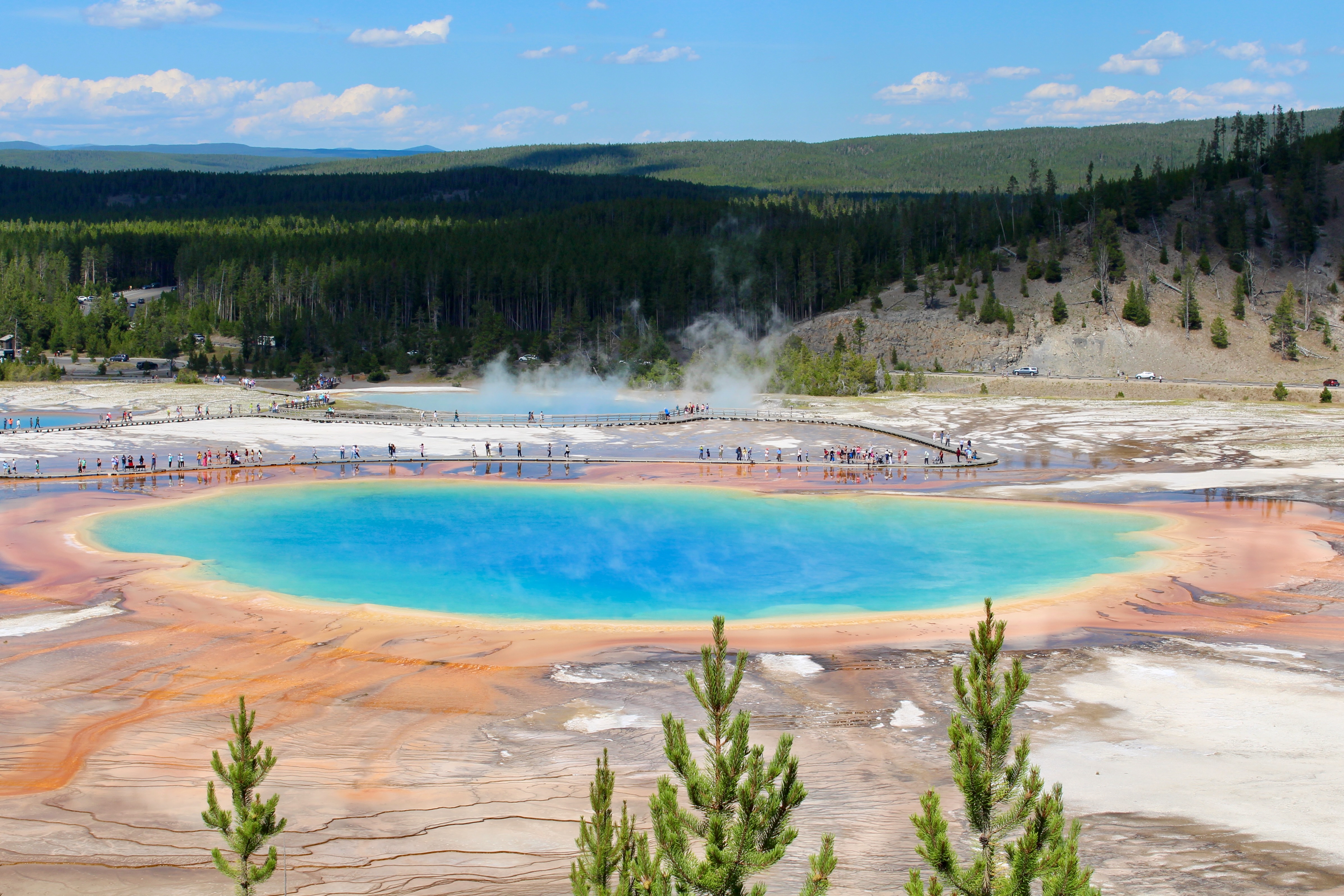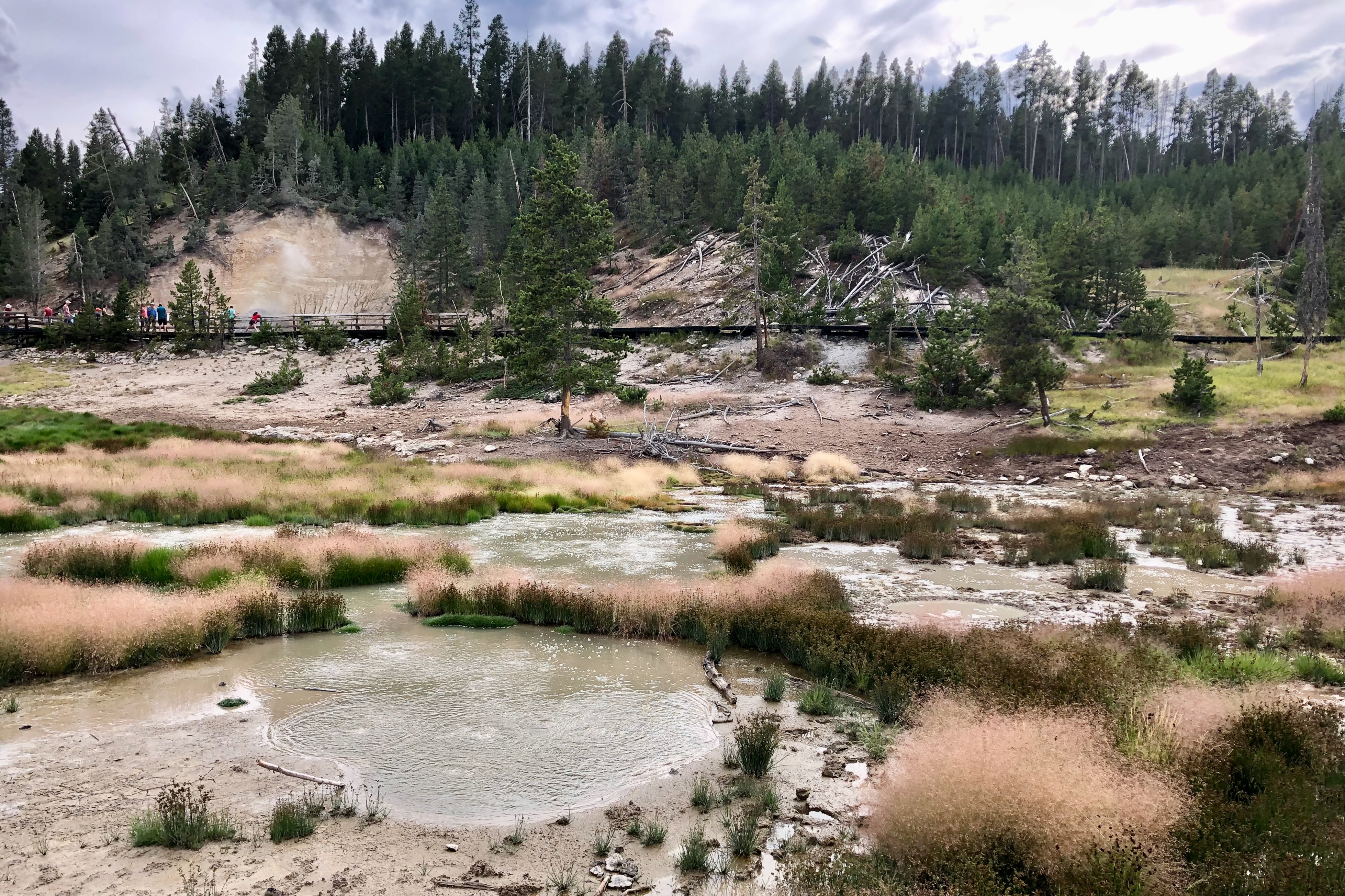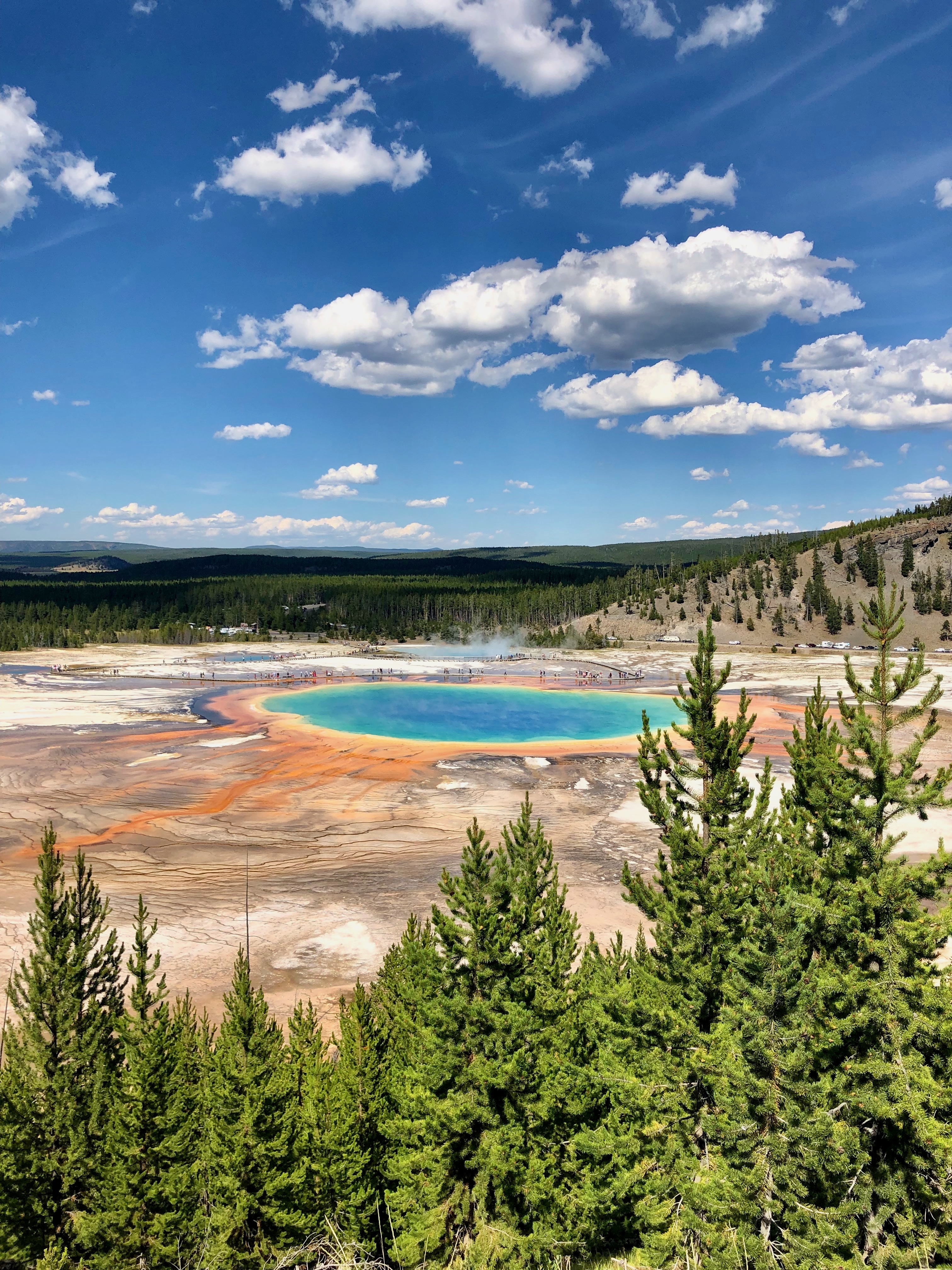 Yellowstone’s most iconic sight is the Grand Prismatic Spring, the largest hot spring in the park and the country. There are two ways to see this surreal hot spring: up-close from the boardwalk on the Midway Geyser Basin Trail, or birds-eye from the Grand Prismatic Hot Spring Overlook Trail. We opted for the overlook trail, a 1.5-mile out-and-back path that starts at the Fairy Falls Trailhead.