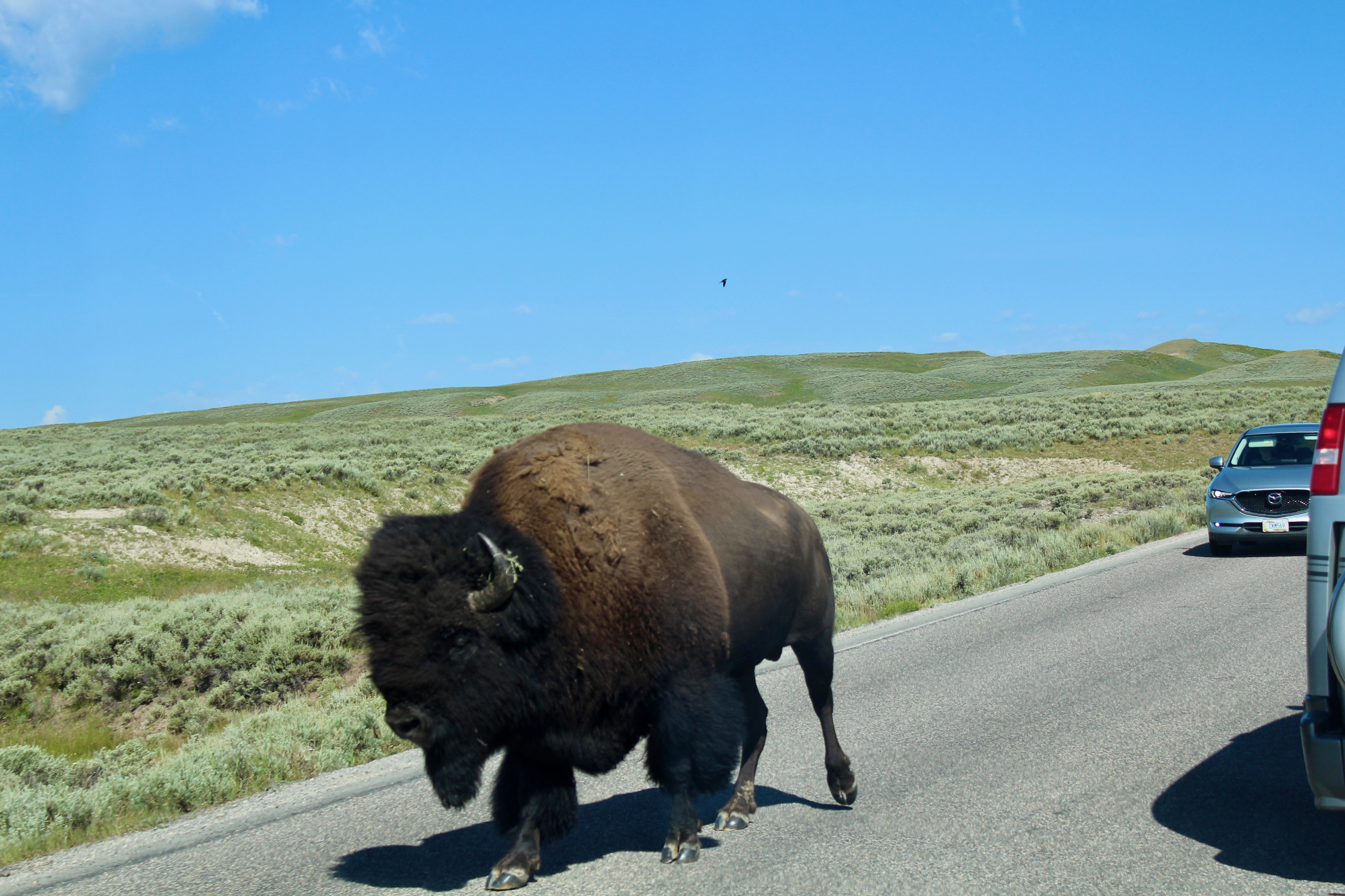 Several bison were hanging out in the middle of the road, quickly leading to an endless line of cars. After an hour of barely moving, we realized we would never make it in time for the flight. Since there was no service to try and change the flight, all we could do was give in to the stunning scenery around us.