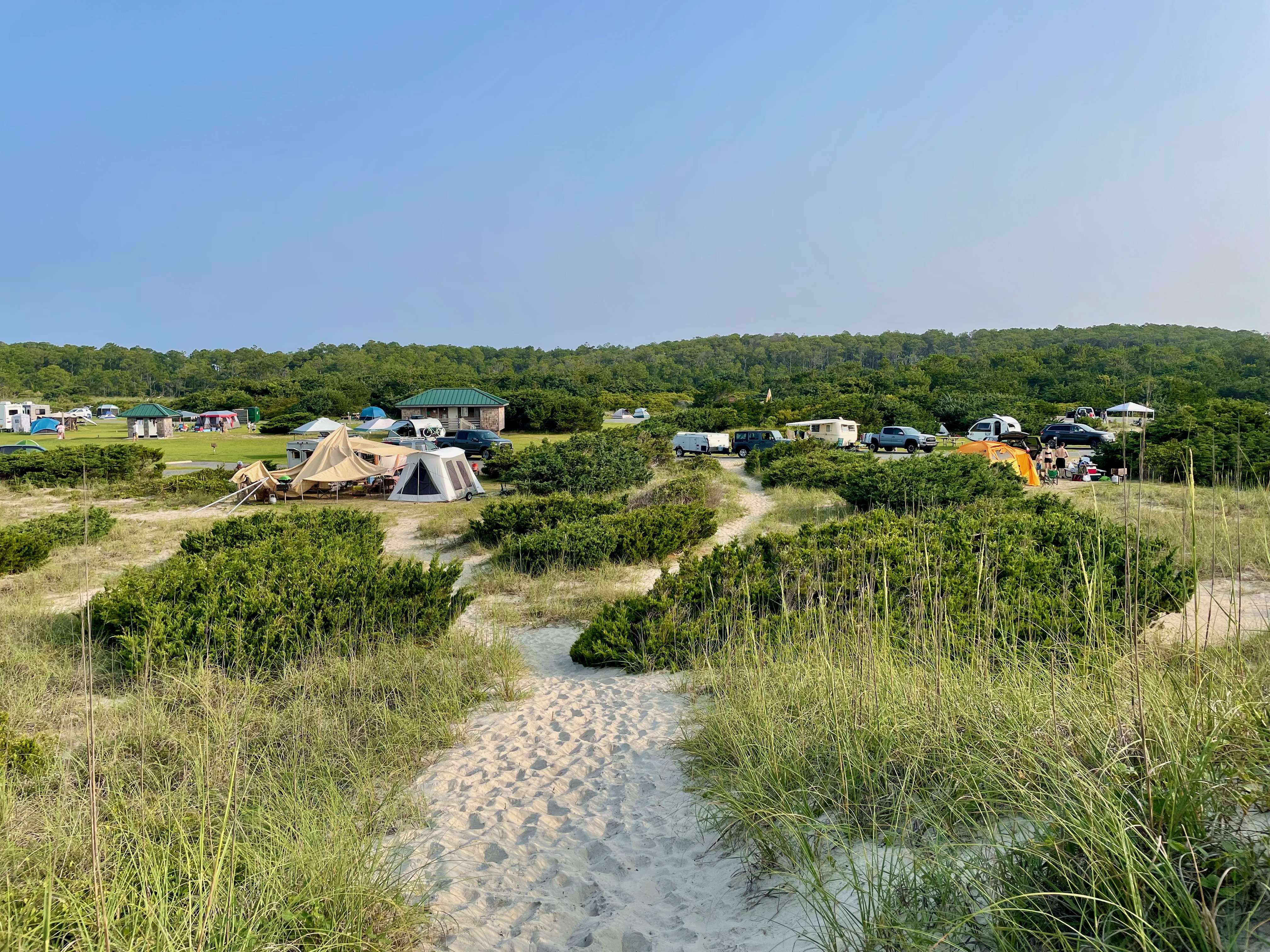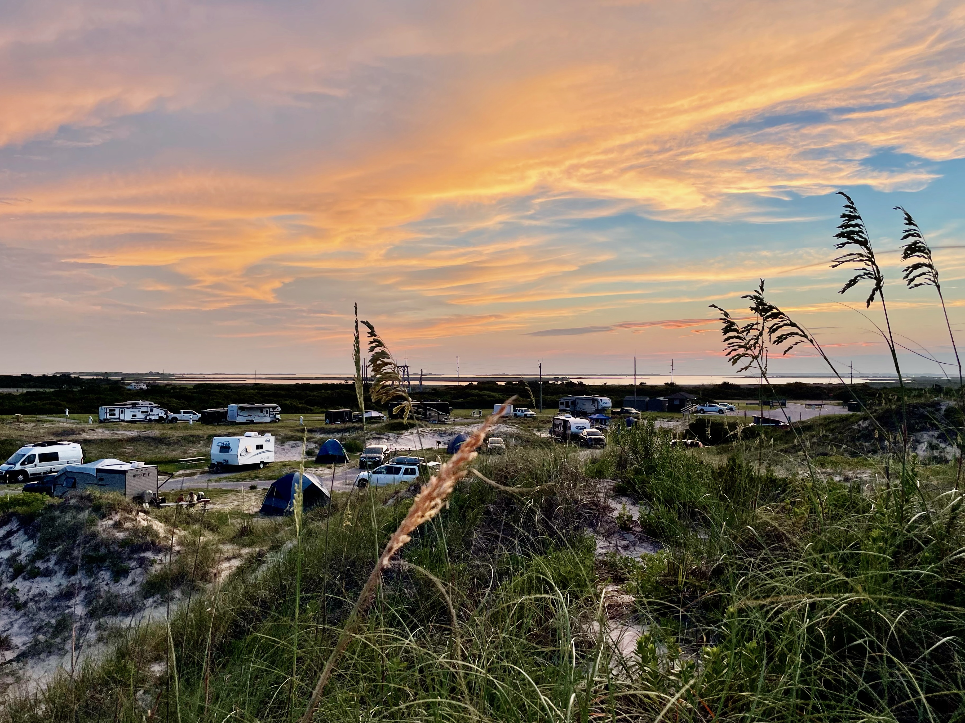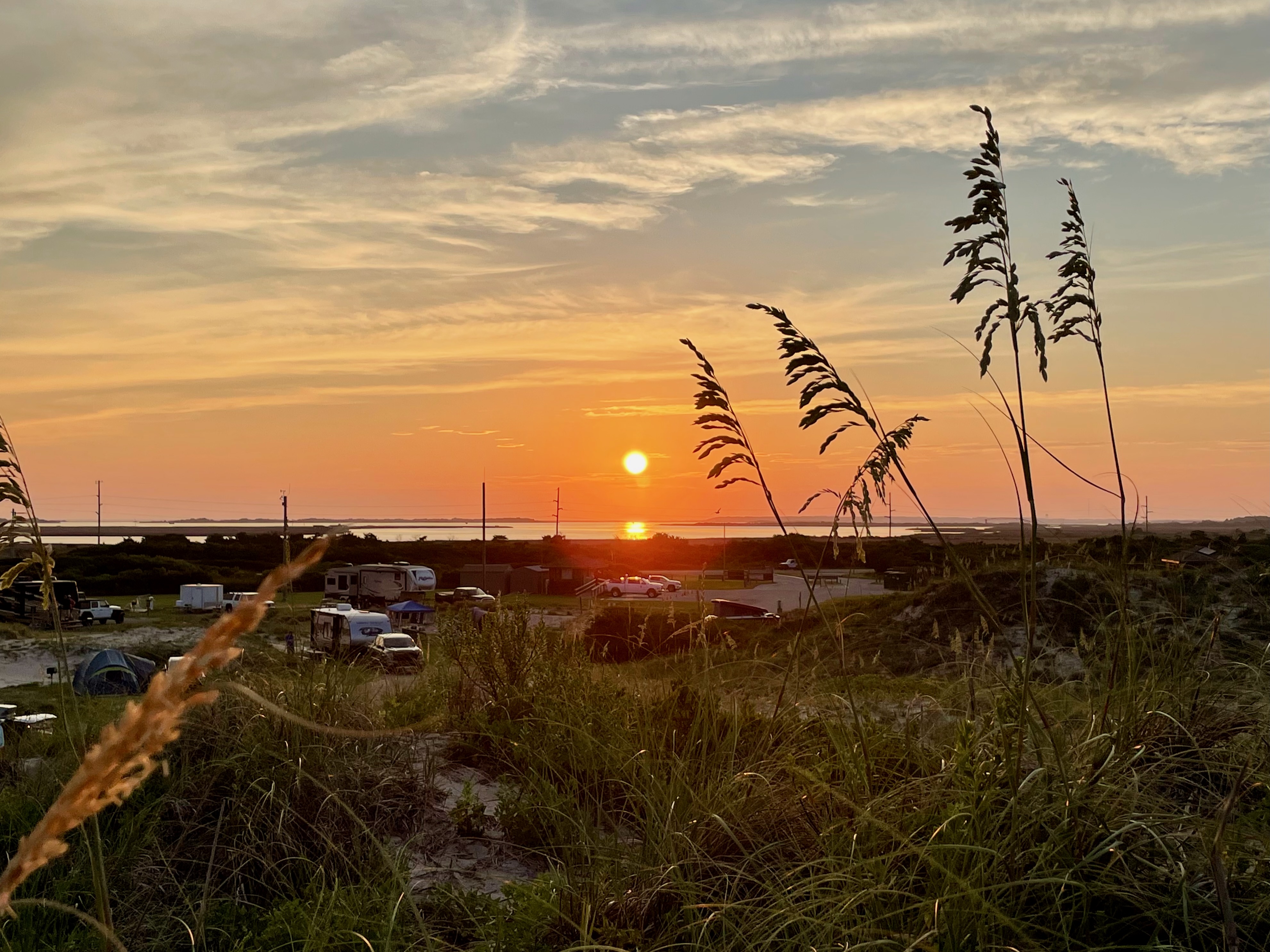 Driving further south, Frisco Campground is located where Hatteras island turns to the west. As the campground is set on a bluff, select spots on the P-loop come with scenic ocean views. The beach is a 15-minute walk from most sites, which are secluded compared to the other OBX campgrounds. There are no hookups and the showers are very refreshing (read: the water is ice-cold).