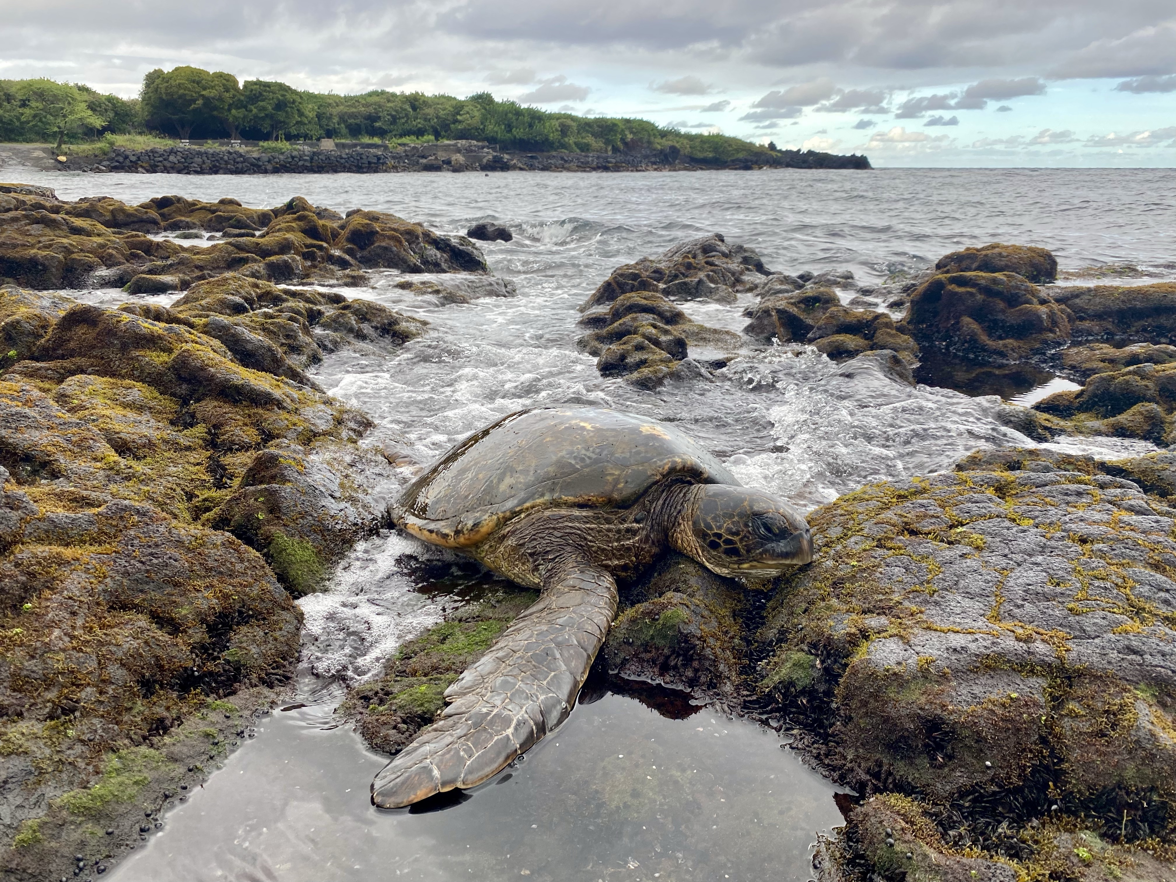 The road passes by Punaluʻu Beach, a black sand beach that attracts green sea turtles. This impressive big guy ended up as the only green sea turtle we spotted in Hawaii.