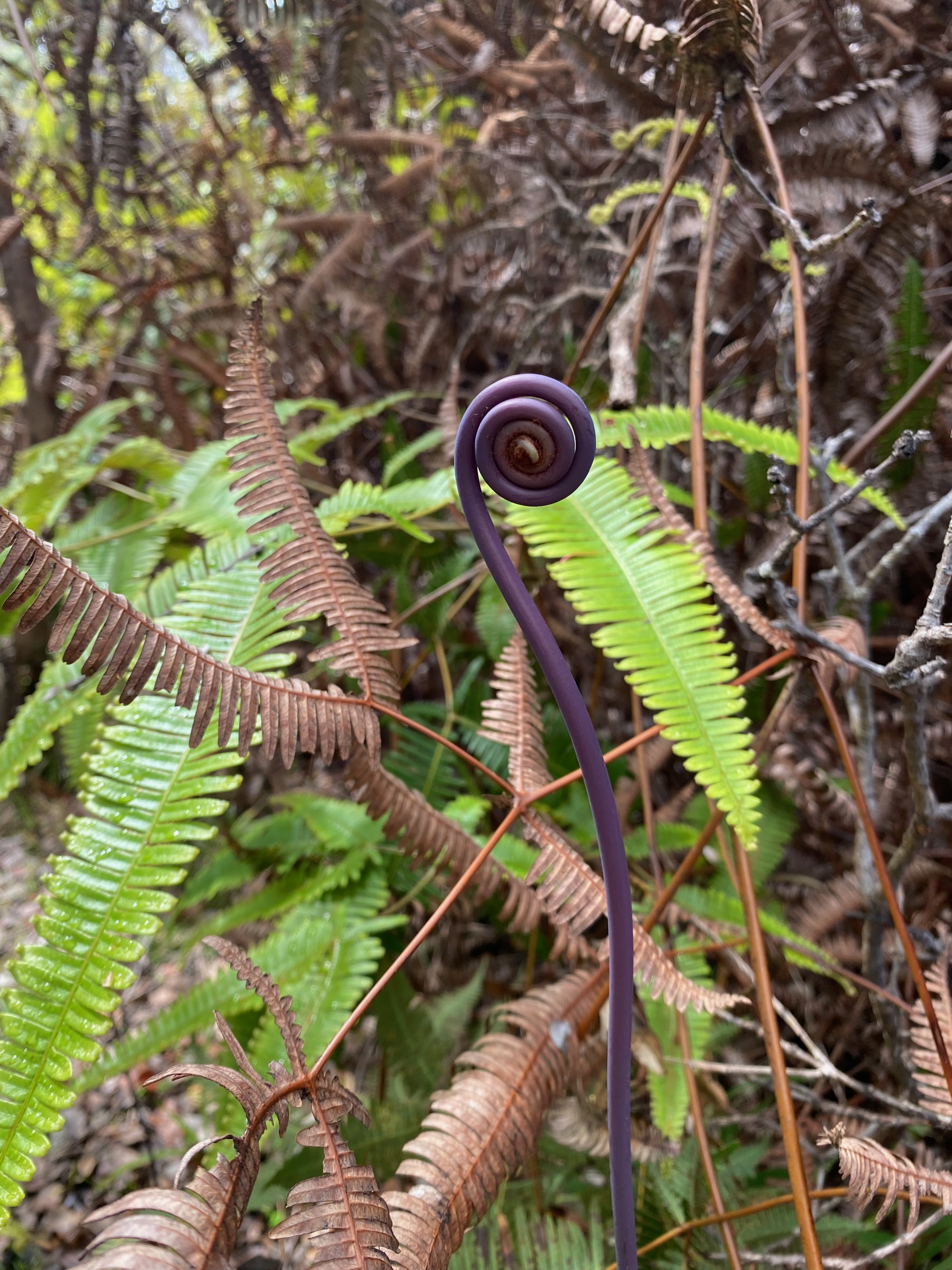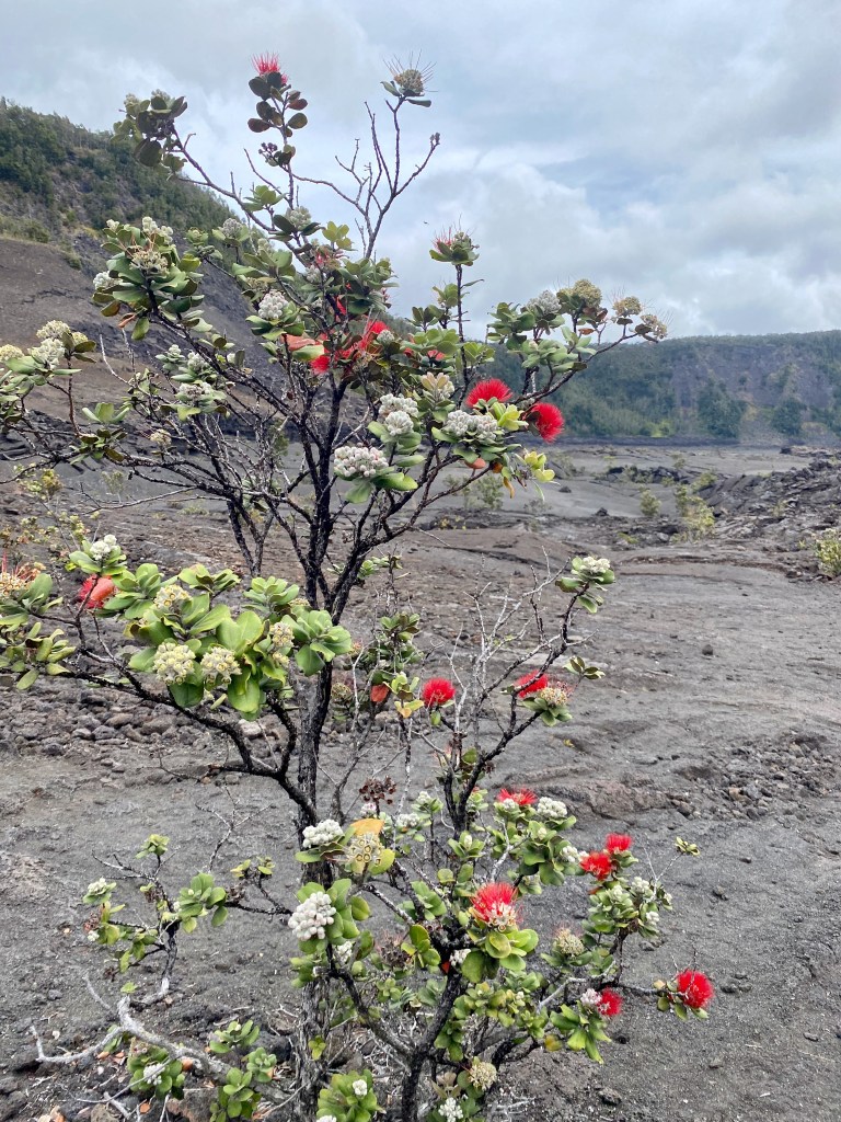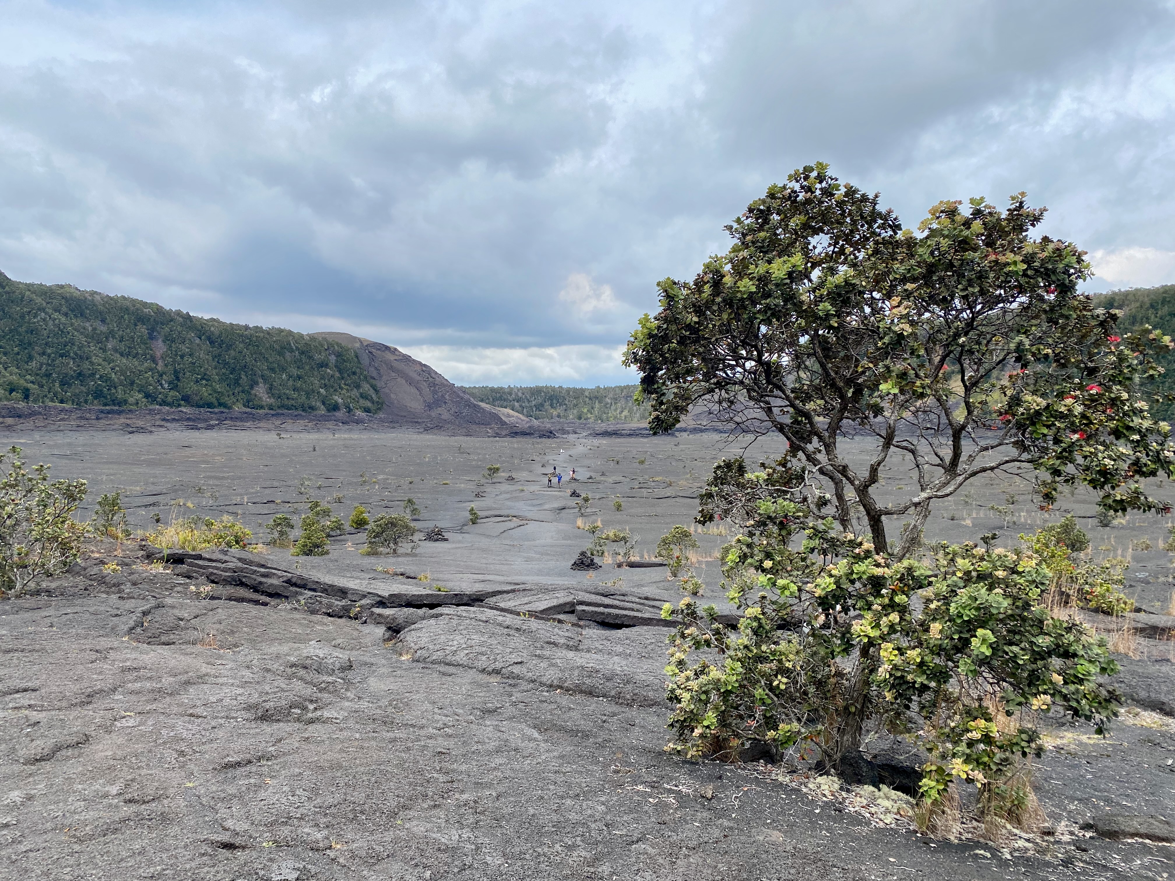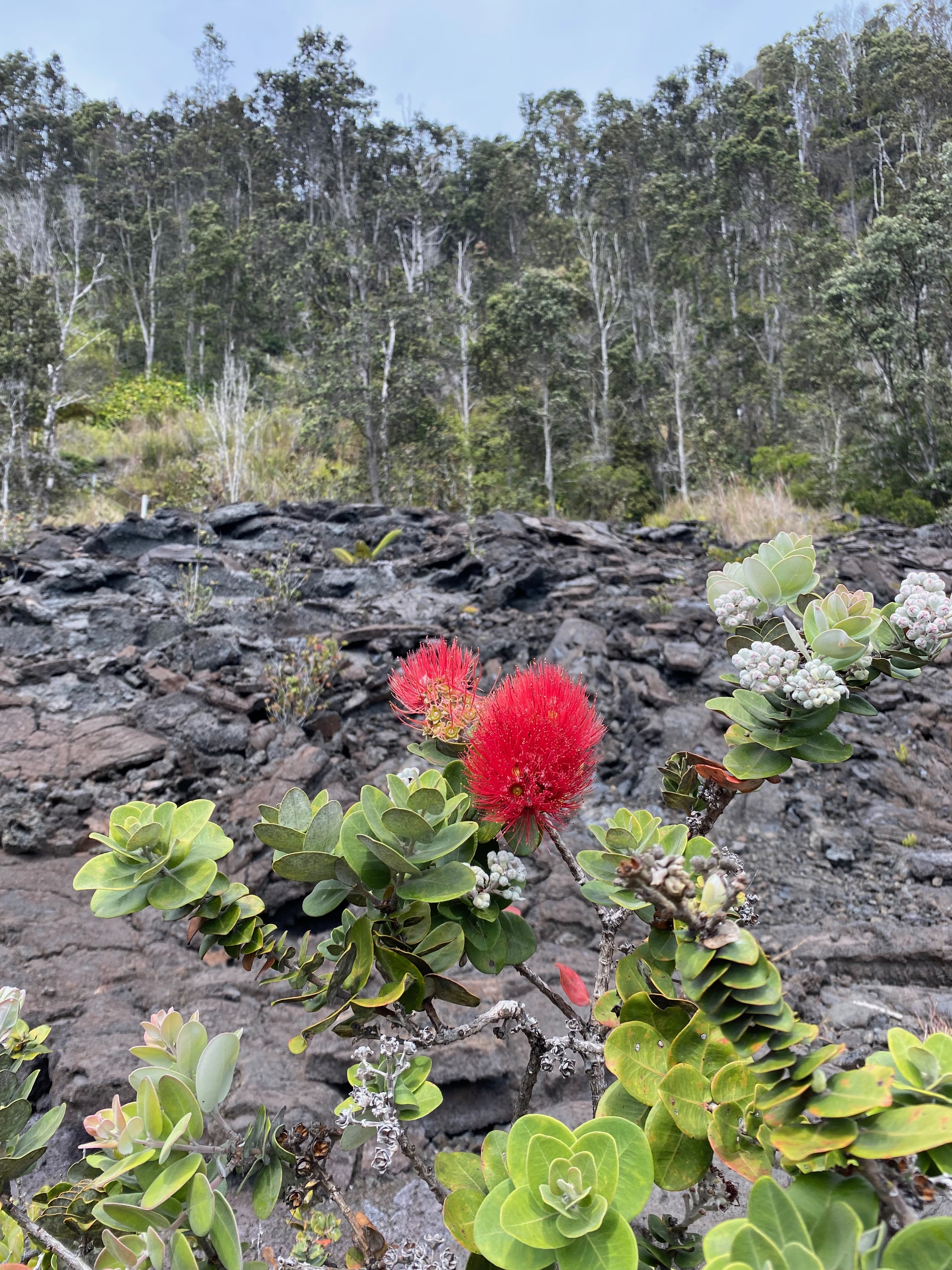 The next morning, we embarked on the four-mile Kīlauea Iki Trail. The trail begins in lush rain forest on the crater rim before descending into the crater. Along the trail you can admire a variety of local flora, like the striking Ōhiʻa trees and their red blossoms. The Ōhiʻa is an endemic species that can only be found in Hawaii and has adapted to grow directly in lava rock.