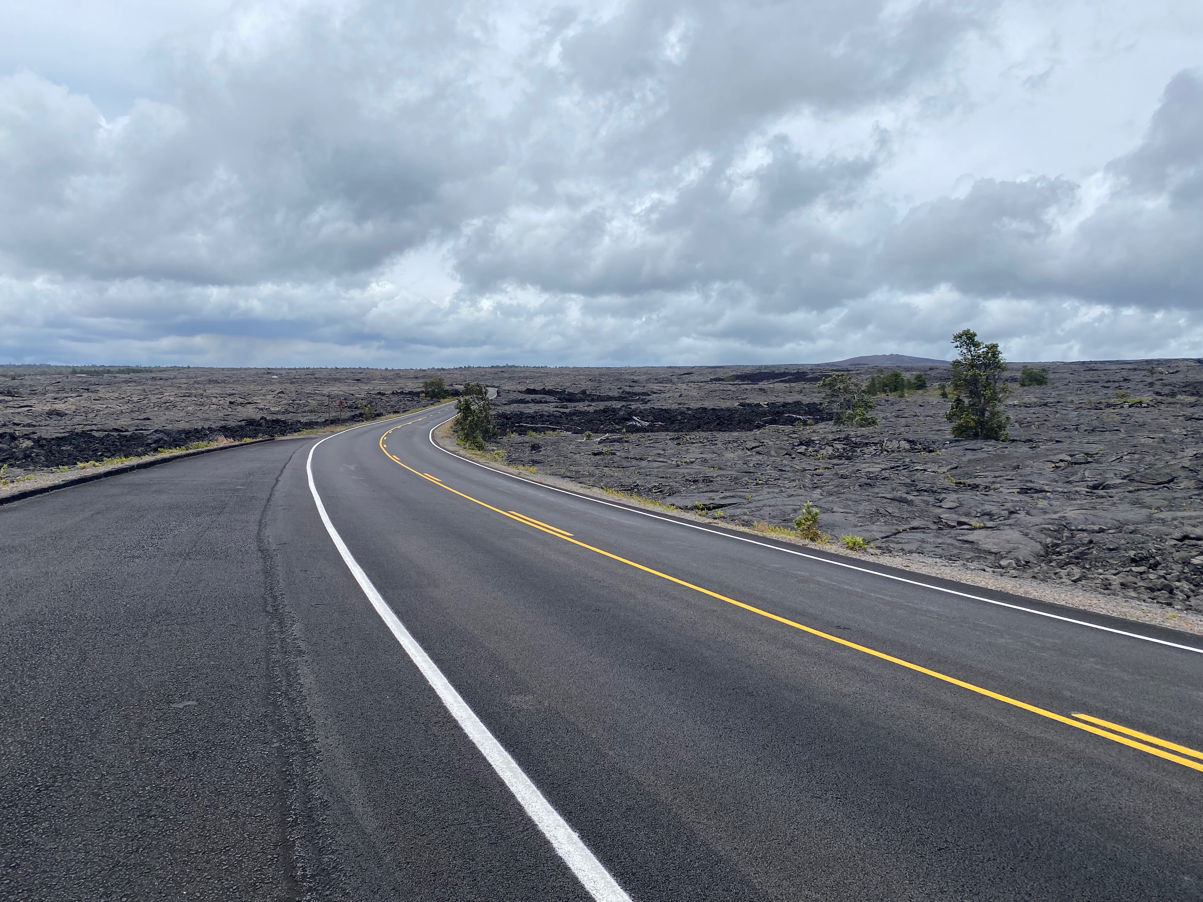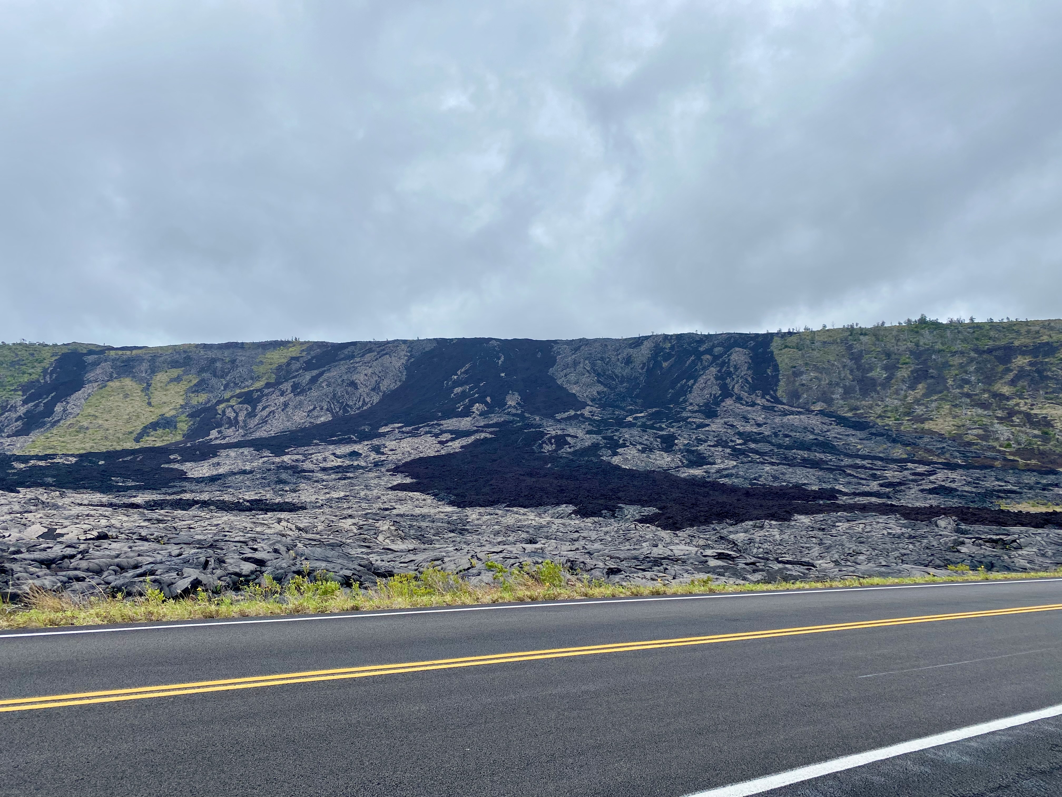 From Crater Rim Drive, we entered the Chain of Craters Road. Starting at 4,000 ft. elevation, it runs all the way to sea level over a span of 19 miles. The road cuts right through the lava created by past eruptions. From overlooks above, you can spot the dried lava streams into the ocean.