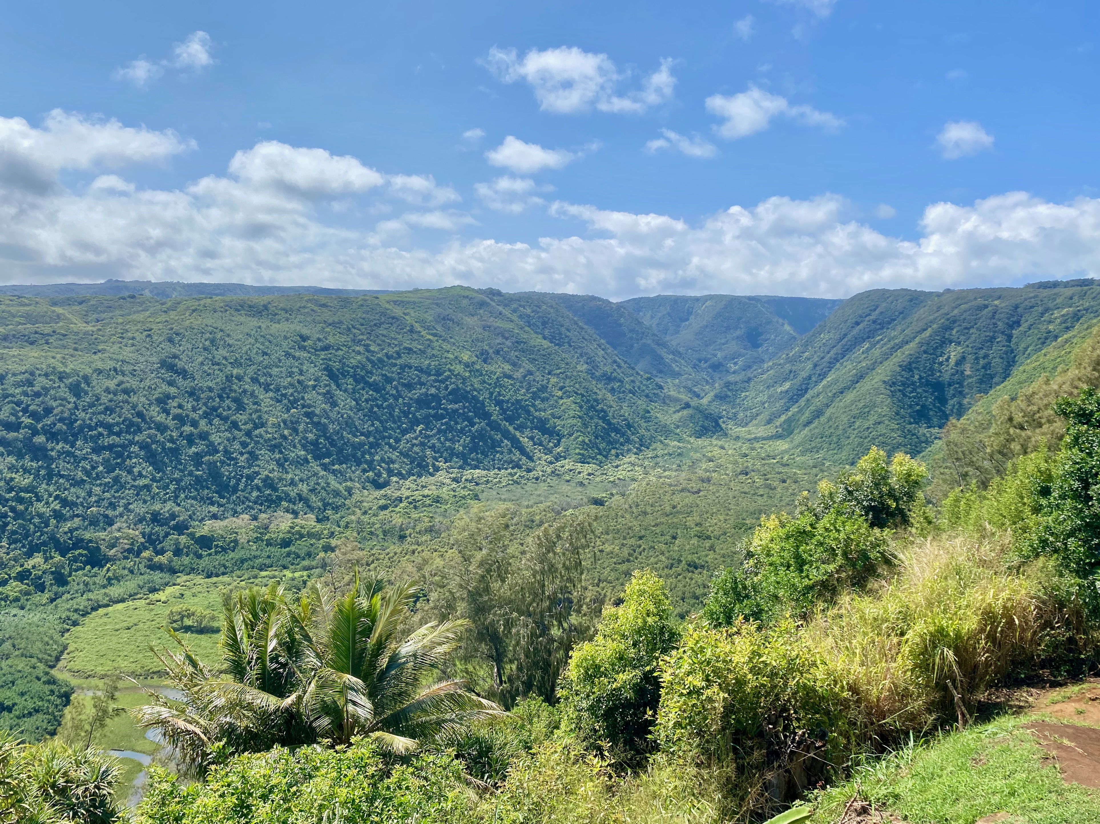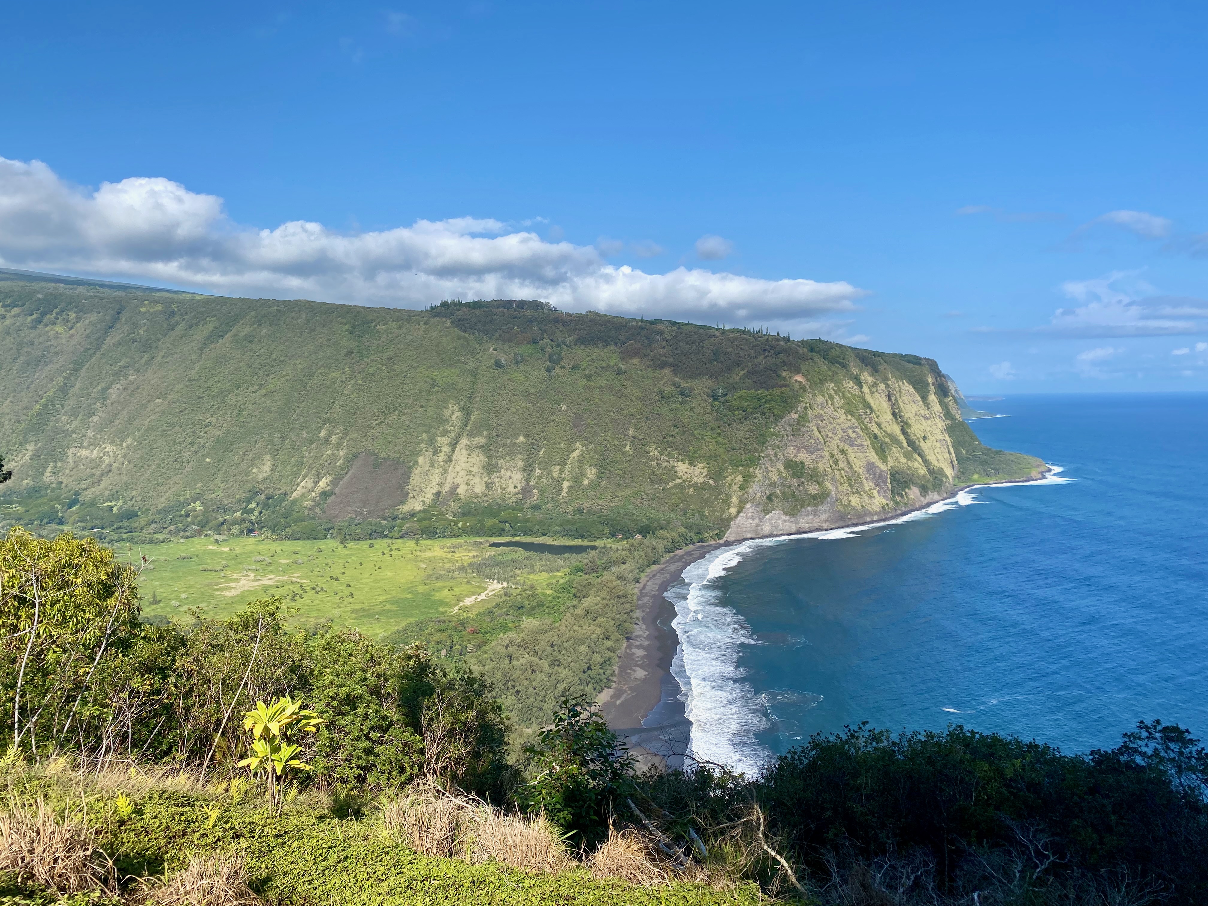 The Pololū Valley Overlook lies at the other end of Waipi’o Valley Overlook, with seven valleys in between. A short hike leads to the valley floor and the black sand beach.