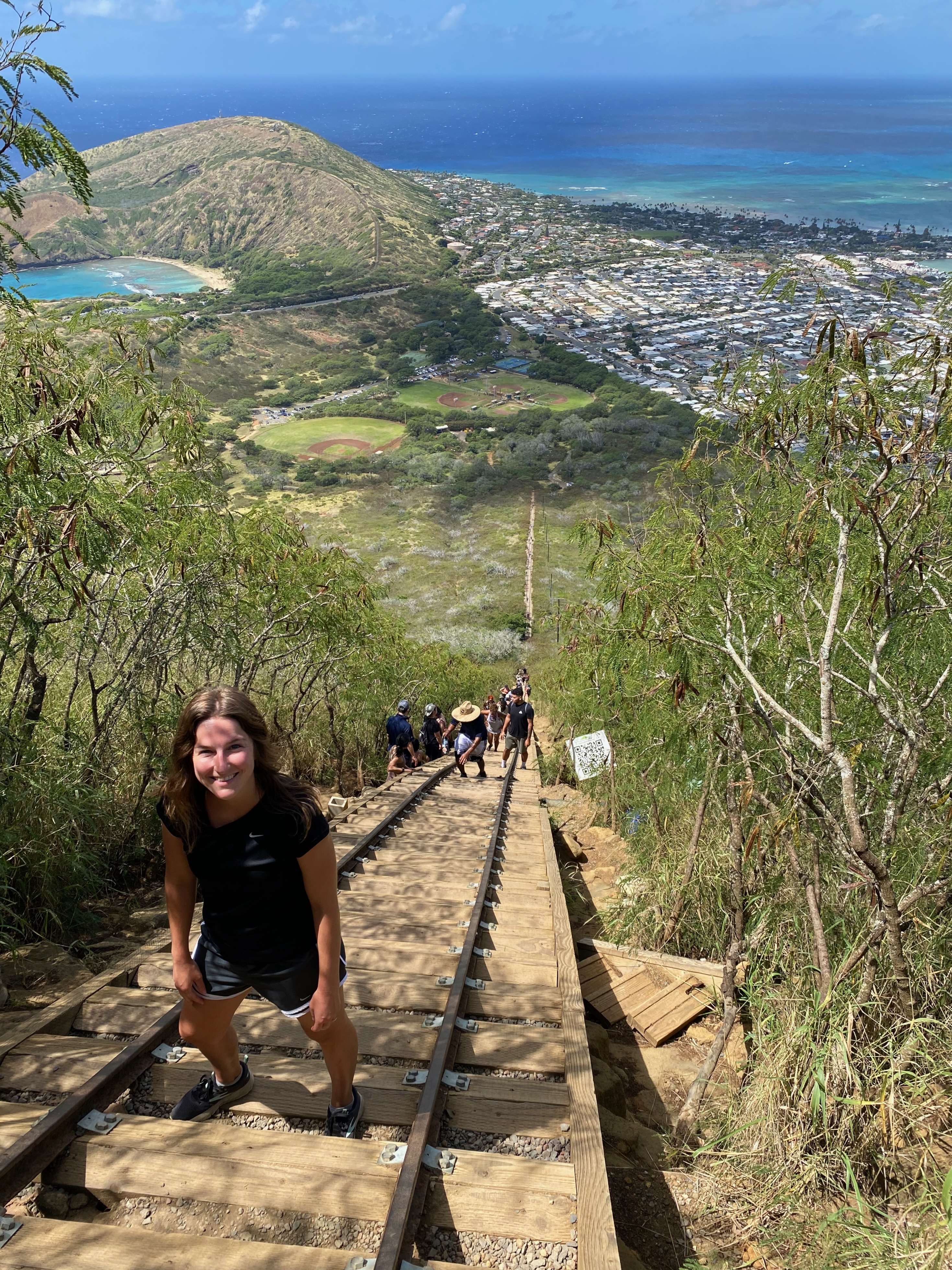 We started our day with a unique but arduous hike. The Koko Crater Trail climbs an old railroad track to panoramic 360° views of southeast O’ahu. With 1,048 railroad ties to overcome and close to 1,000 ft elevation gain, this 1.6 mile hike qualifies as a strenuous morning workout.