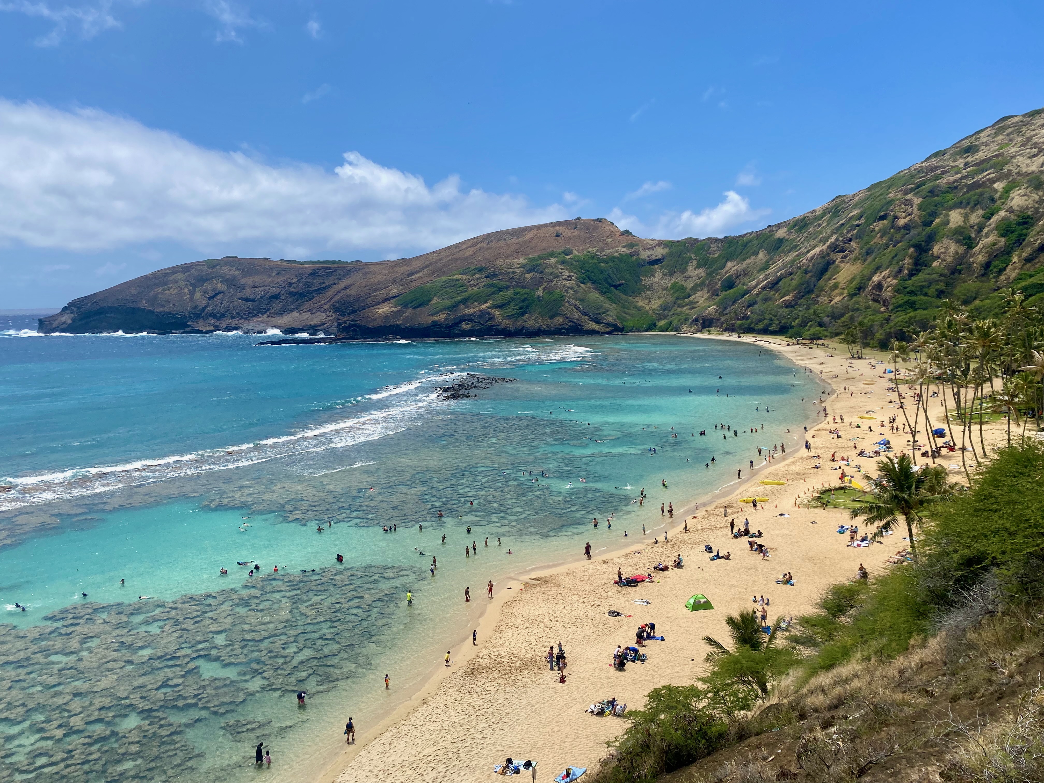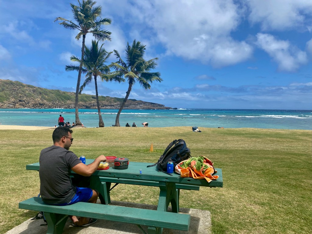 The coral reefs close to the shore make Hanauma Bay an extraordinary place for snorkeling. We saw a large variety of tropical fish, although it didn’t top our snorkeling experience at Two Step on the Big Island. Despite the diverse marine life, the fish are less abundant and the shallow waters can make it tricky to navigate above the sharp coral. The bay provides the perfect setting for a picnic, before heading back to Honolulu