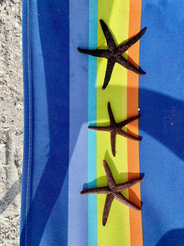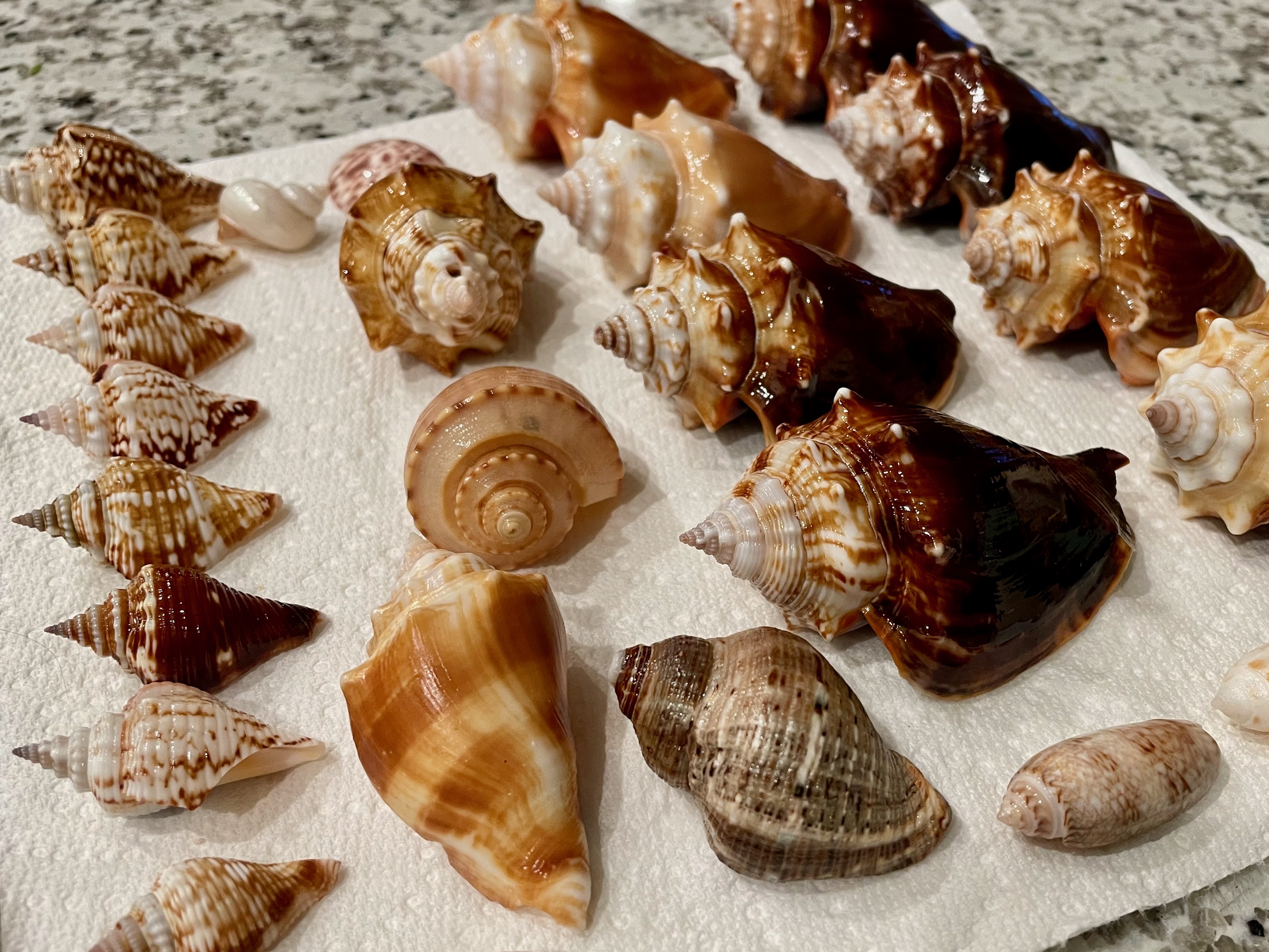 Florida’s prized shell is the Junonia, but we didn’t come across one. We did find an abundance of banded tulips, lightning whelks, pear whelks, murex shells, some alphabet cones, a nutmeg and small horse conch, Florida’s state shell.