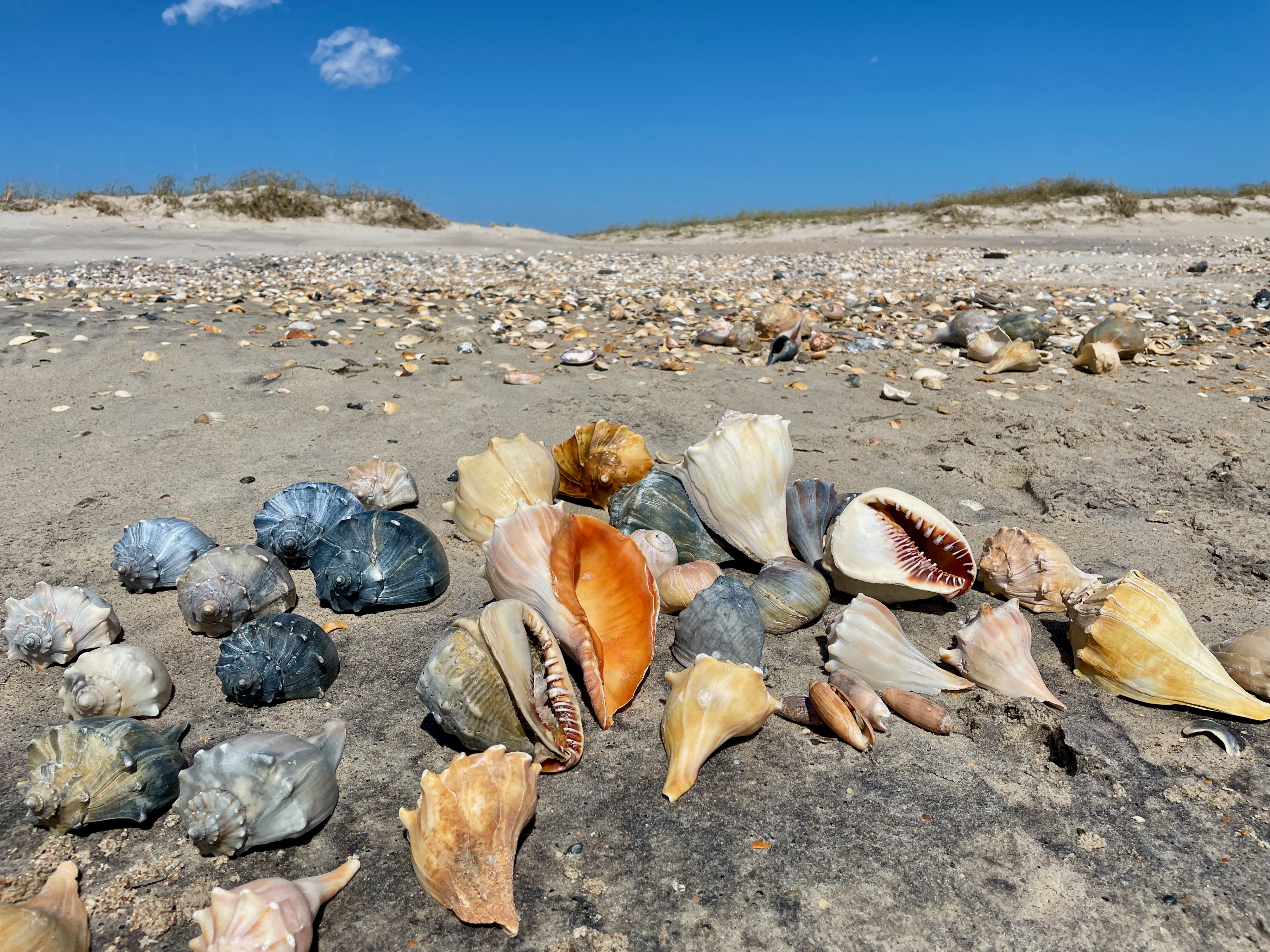 The number one find is an intact Queen Helmet, but the giant knobbed whelks in striking colors are a great consolation prize. We also found channeled whelks, lightning whelks, olives and shark eyes, all in abundance. Our bags were getting so heavy we actually had to make a though selection on the beach.