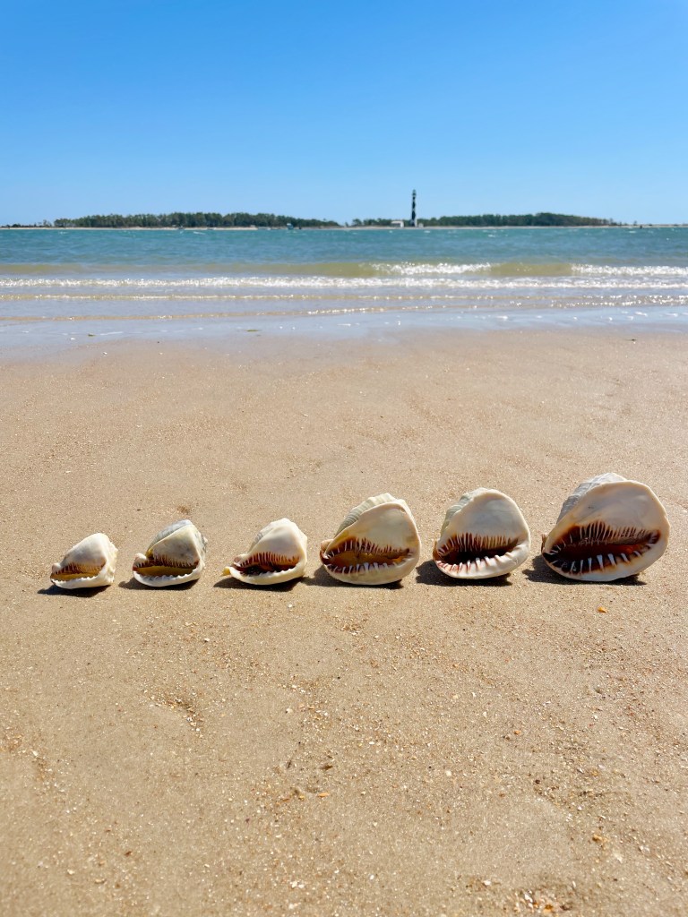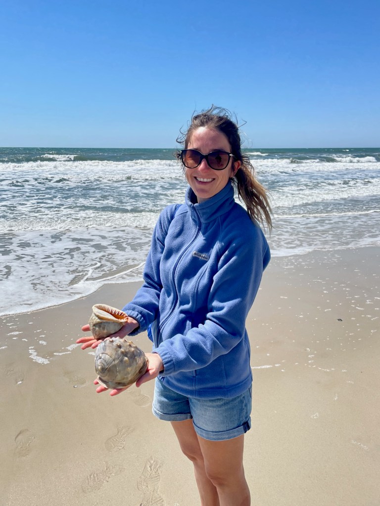 We went shelling on Ocracoke Island twice, in spring and winter. On our winter escape, we found over 30 intact scotch bonnets, North Carolina’s prized state shell. In addition, we collected olives, knobbed, pear and channeled whelks, sundial shells, scallop shells in a range of beautiful colors, shark eyes, moon snails, and even a king’s crown.