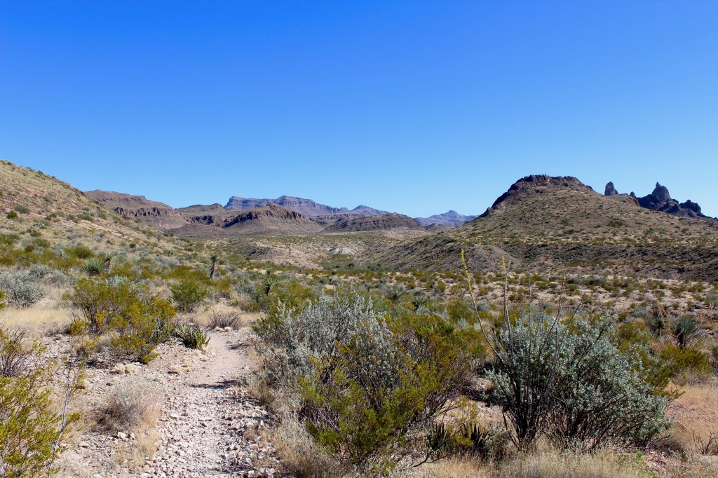 The Mule Ears Trail departs from an overlook along the Ross Maxwell Scenic Drive, about halfway to the Santa Elena Canyon. You can hike the 3.8 miles out-and back Mule Ears Spring Trail to an overgrown spring, or continue to the junction with the Smoky Creek Trail for up-close views of the Mule Ears peaks. The trail runs straight through the desert, with no shade at all.