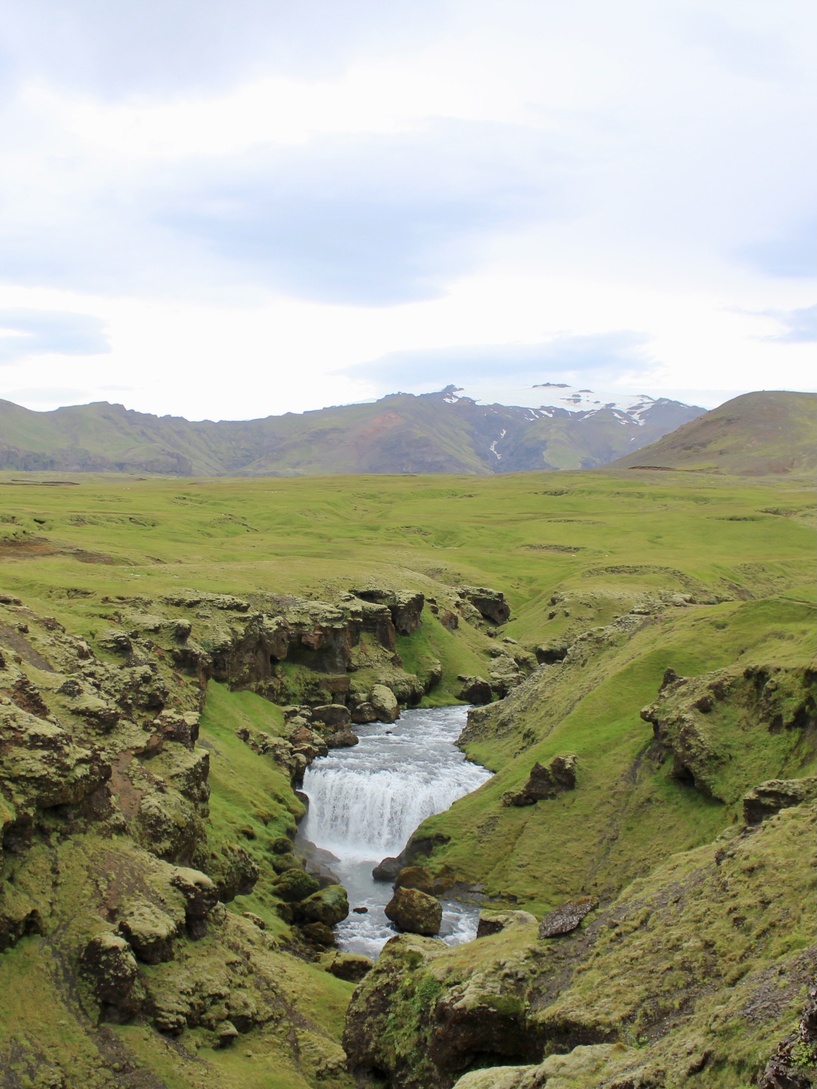 The trail can be divided into three parts. The first section winds up next to Skógafoss through a lush green canyon, passing another 25 waterfalls. It entails a constant but gentle climb over a course of 8 km, surrounded by stunning scenery. The end of this section is marked by the wooden bridge over the Skógá River.