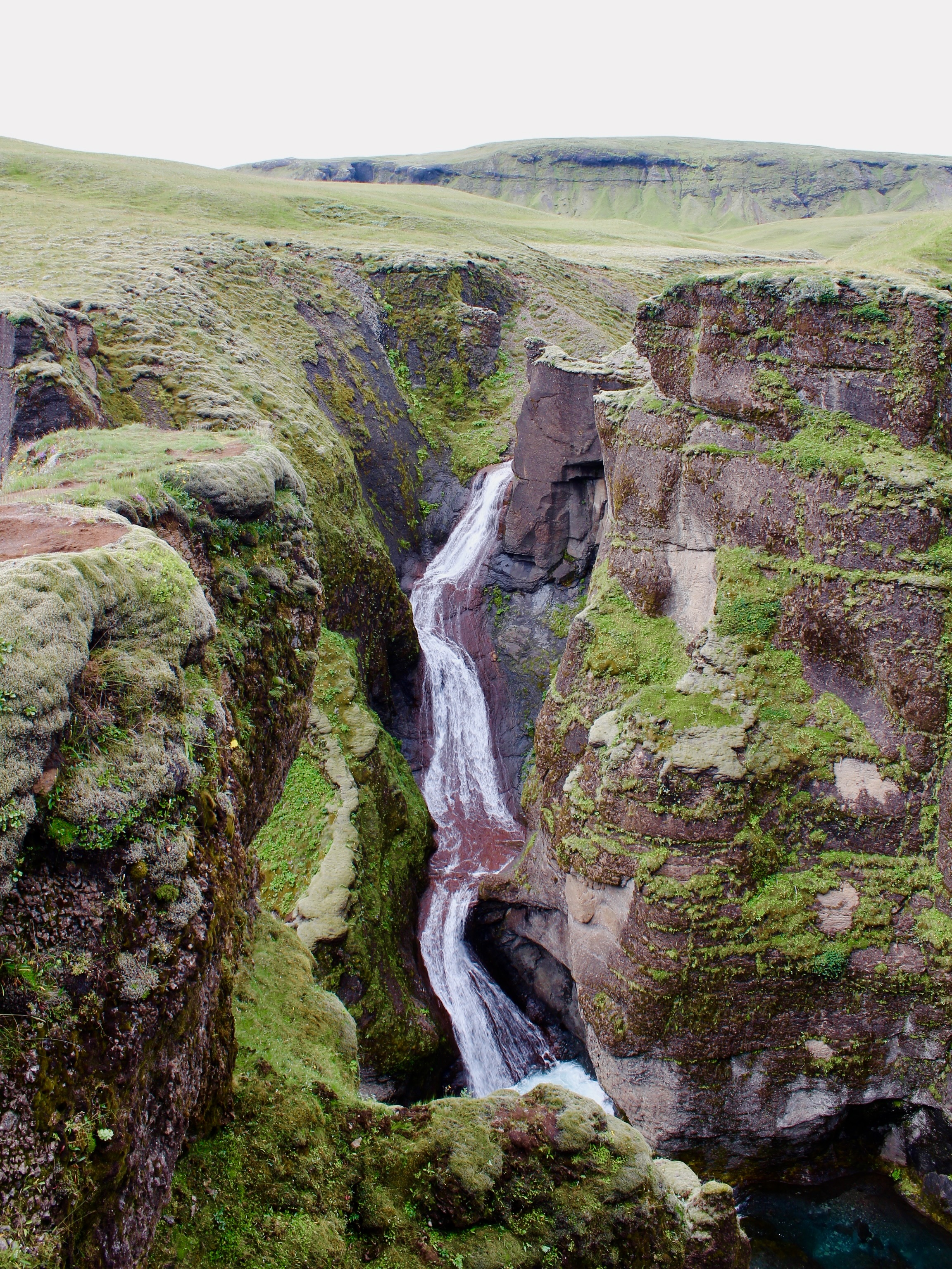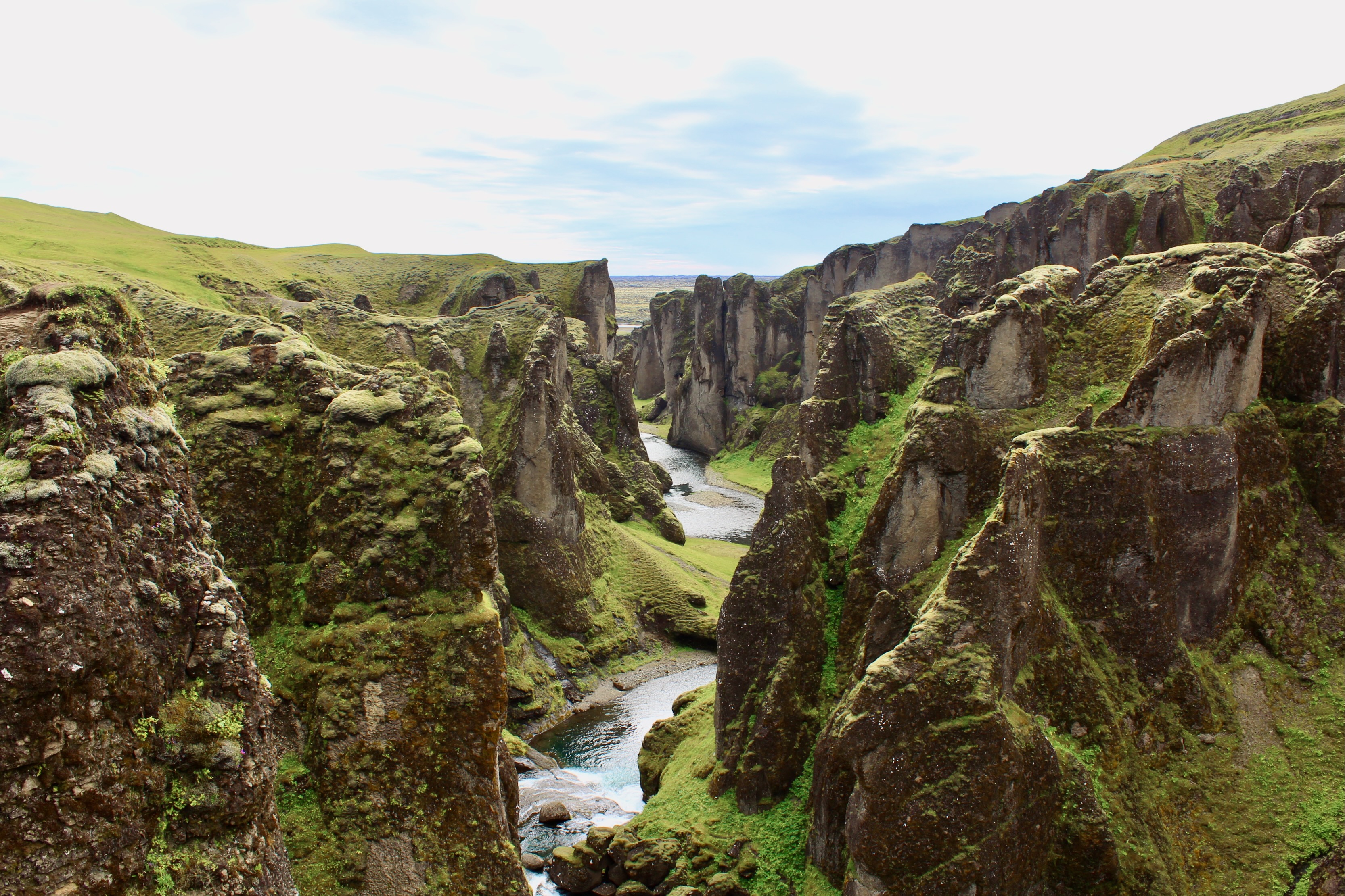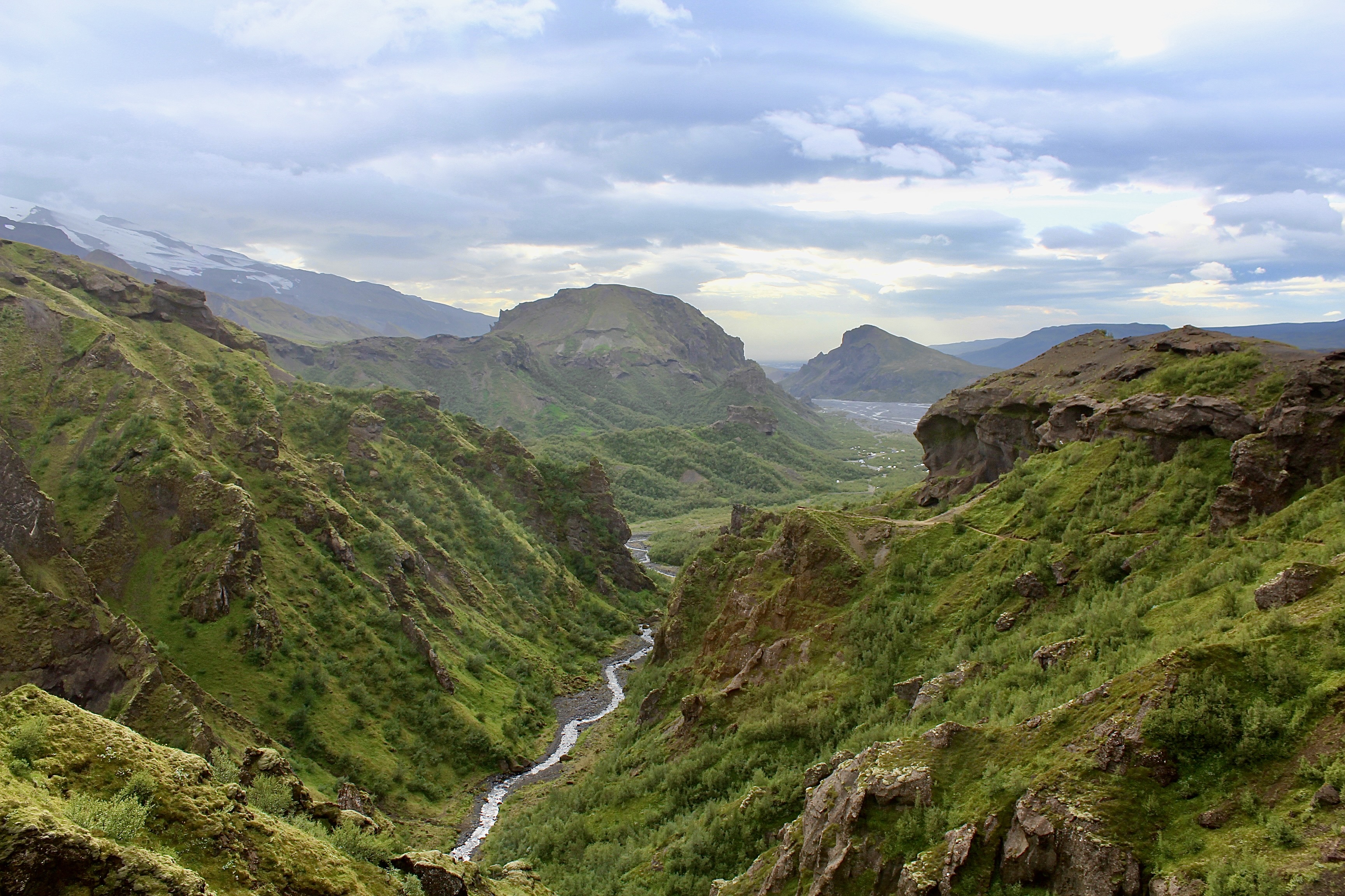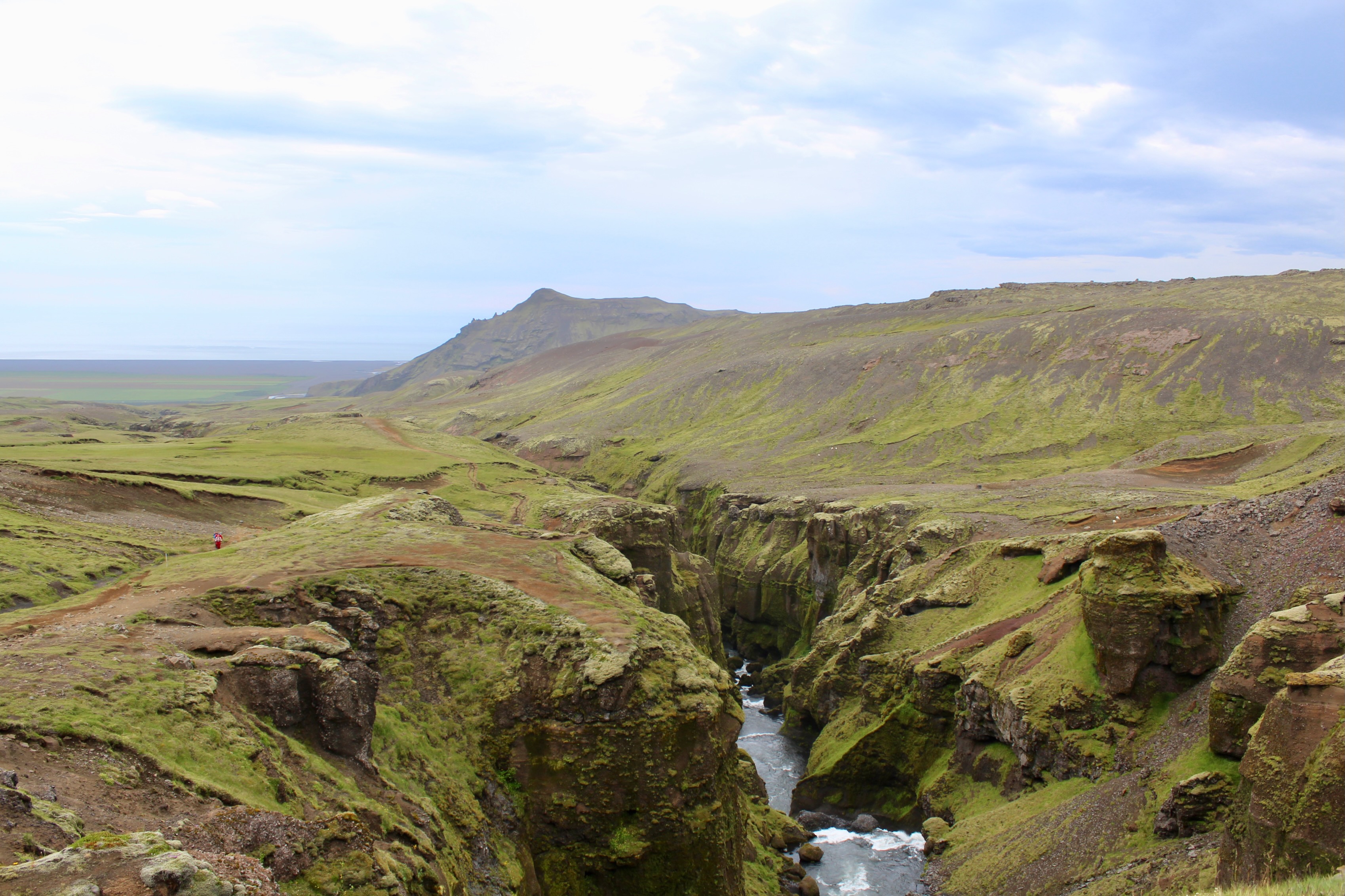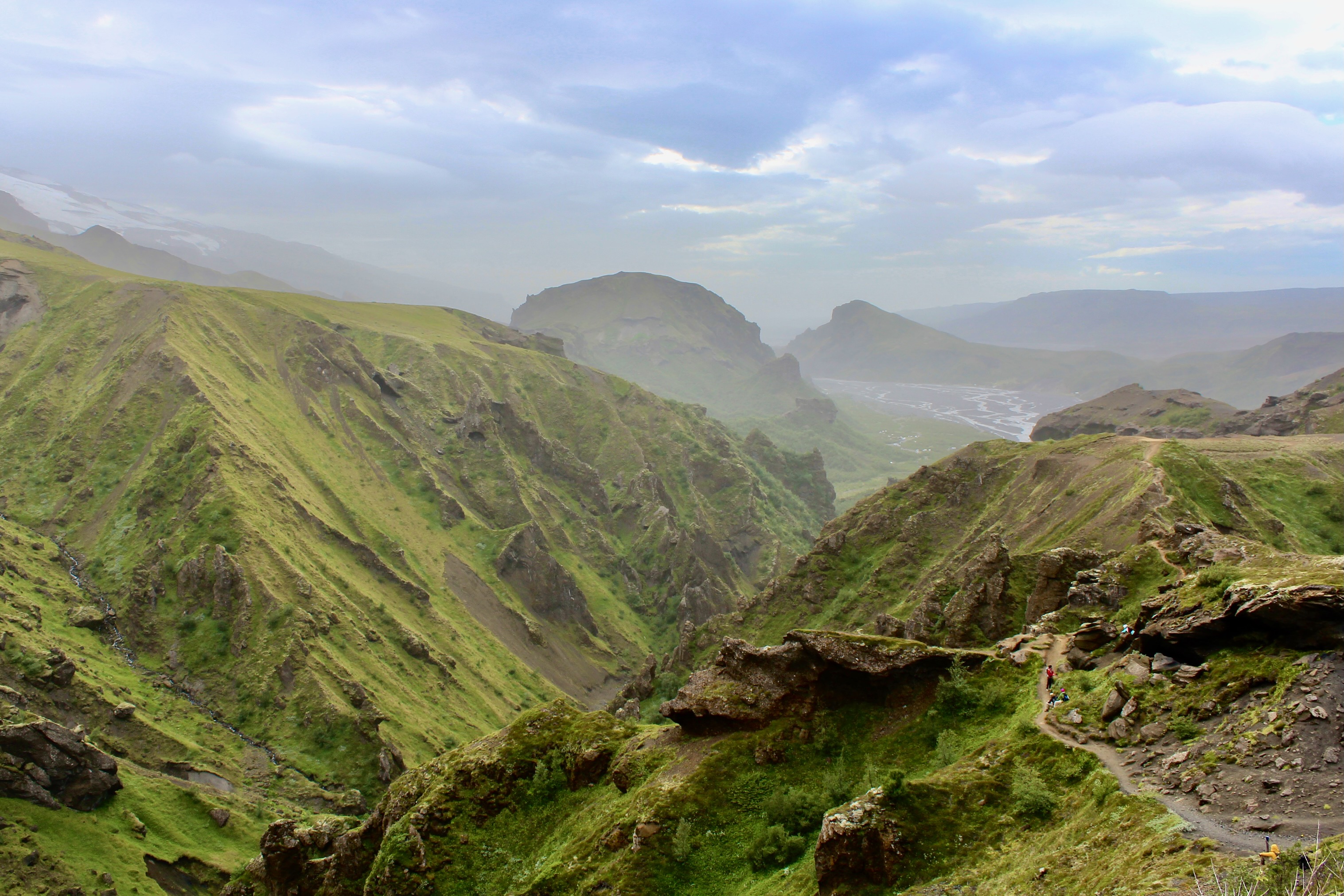 The last section of the hike is a thrilling descent into Þórsmörk through a spectacular canyon. There are a couple of nerve-wracking parts, even if you just have a remote fear of heights. At one point the trail clings to a cliff, with a loose-hanging rope barely providing support. The grand finale is the cat’s spine, a narrow path flanked by the abyss on both sides.