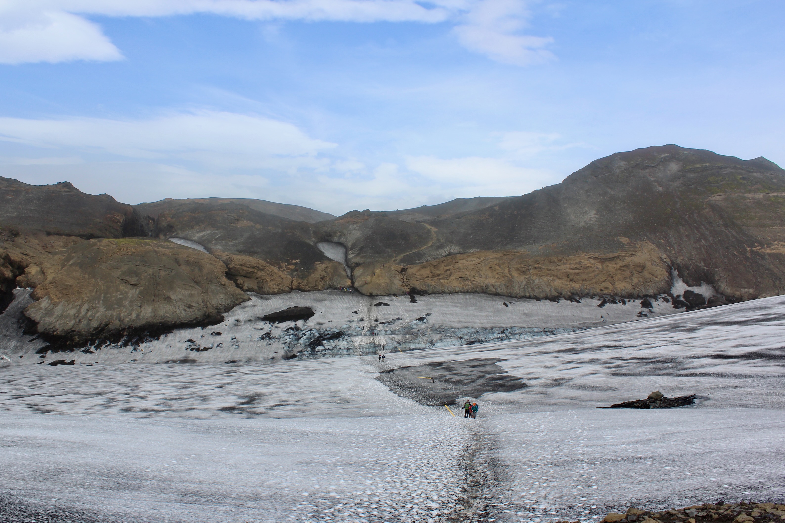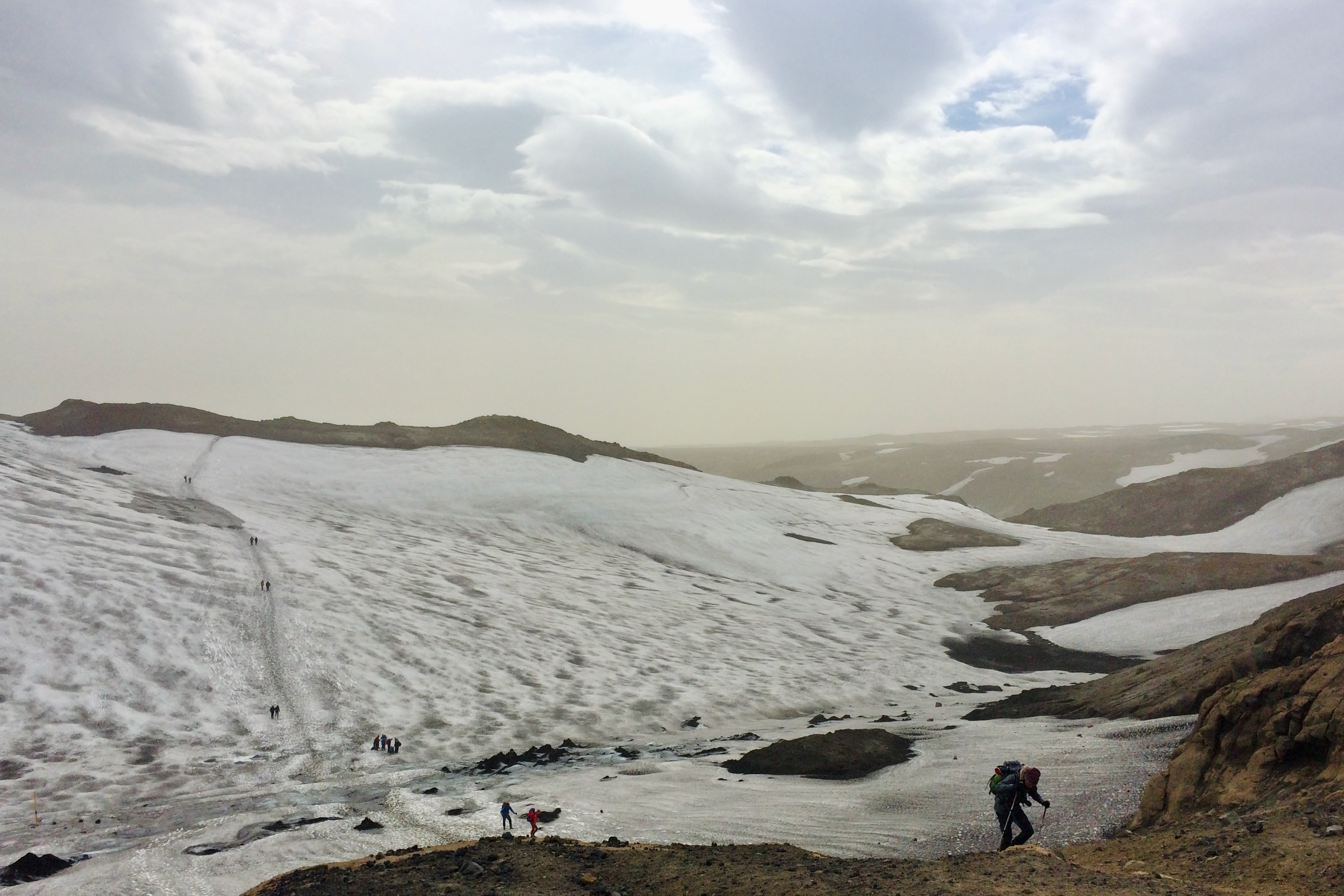 The green pasture makes way for a barren and rocky landscape before leading up to the snow-covered Fimmvörðuháls Pass. This is the most strenuous section of the hike, as you plow through snow fields and volcanic soil while exposed to the elements. The last part of this section runs between glaciers Mýrdalsjökull and Eyjafjallajökull, passing lava fields created by the volcanic eruption that shut down Europe’s airspace in 2010.