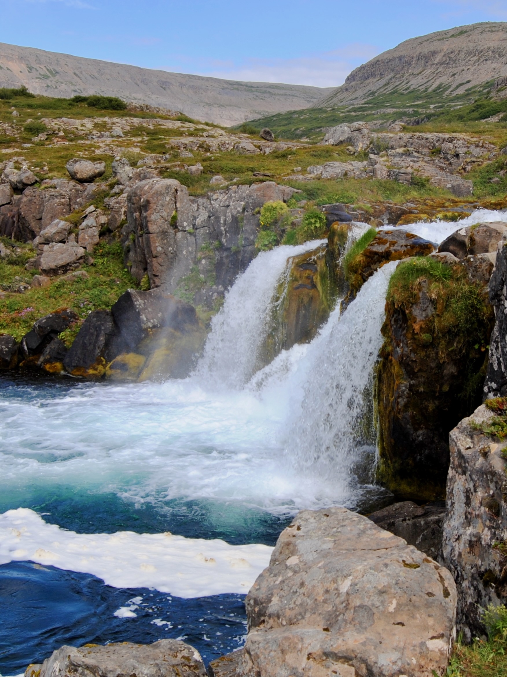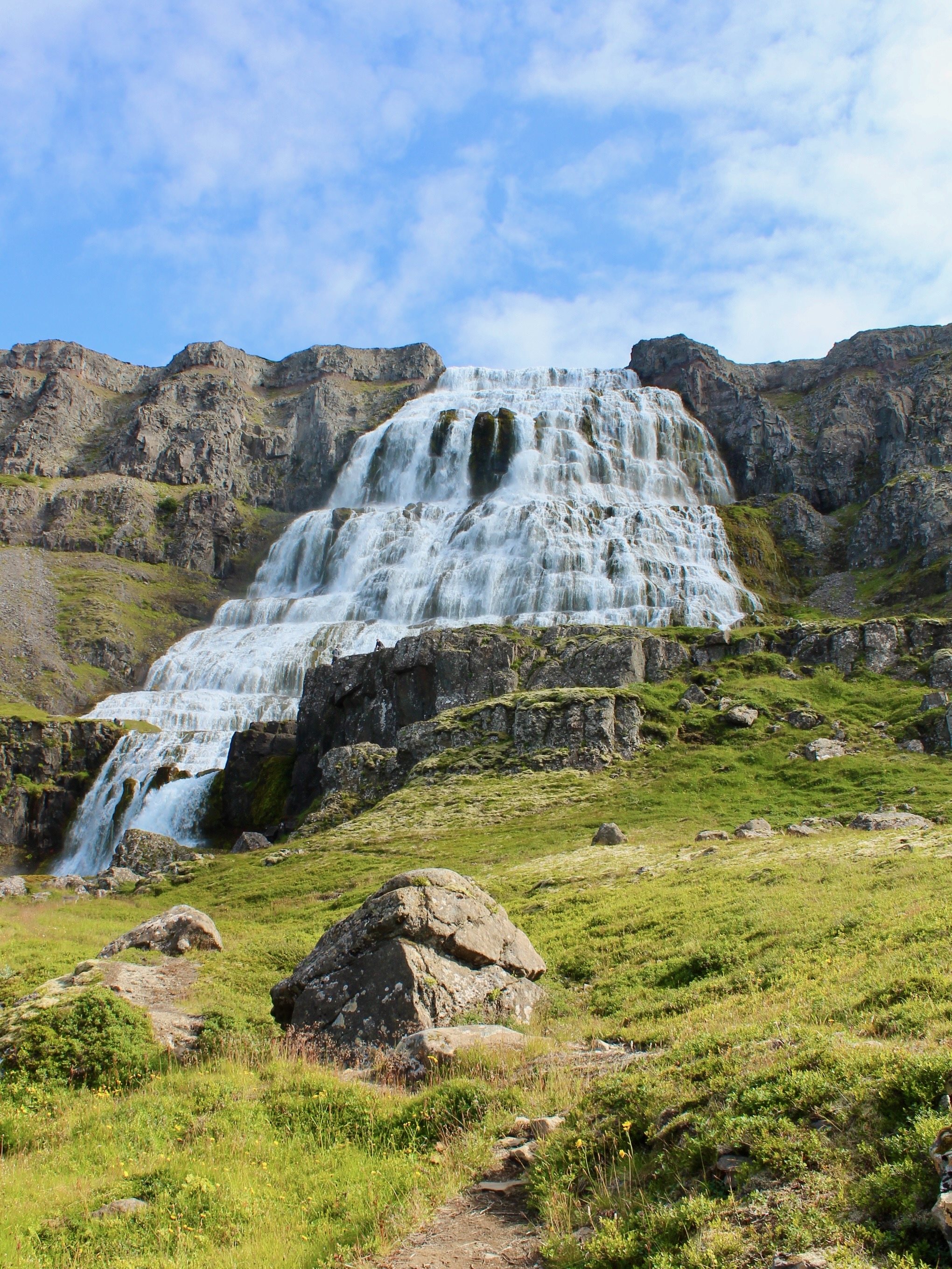 The only road around the Westfjords clings to the fjords without guardrails, assuring some scary moments but above all spectacular views. We started our favorite day of this trip with coffee and a whale sighting at Litlibær Farm, followed by beautiful scenery and tiny fishing villages on the way to Dynjandi waterfall. Just when you are reaching a waterfall-saturation point, this impressive multi-layered waterfall leaves you in awe.